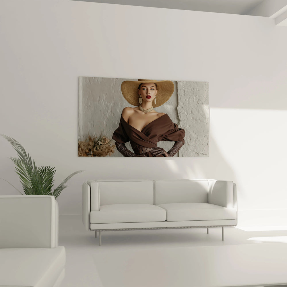 Cette représentation symbolise l'émancipation féminine et la confiance en soi féminine à travers une esthétique vintage revisitée. La palette de couleurs chaudes - marron chocolat, doré et beige - évoque la terre et la stabilité, suggérant une beauté authentique naturelle. Le rouge des lèvres symbolise la passion et la féminité assumée, tandis que les tons neutres du chapeau et de l'arrière-plan créent un équilibre harmonieux. Cette combinaison chromatique apporte une sensation de chaleur et de confort, idéale pour créer une ambiance élégante salon moderne dans un espace de vie.