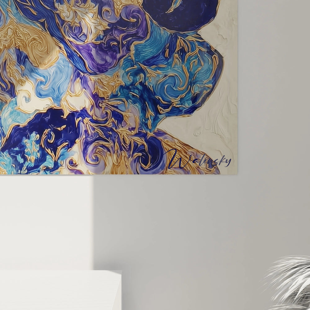 La composition artistique révèle un travail minutieux sur les détails ornementaux, où chaque élément contribue à créer une harmonie visuelle exceptionnelle. La robe de soirée élégante représentée semble flotter dans un environnement décoratif luxuriant, composé de volutes dorées et de motifs baroques haute couture qui enveloppent la silhouette. Ces ornements dorés précieux créent un contraste saisissant avec les tons bleus dominants, apportant une dimension précieuse à l'ensemble.