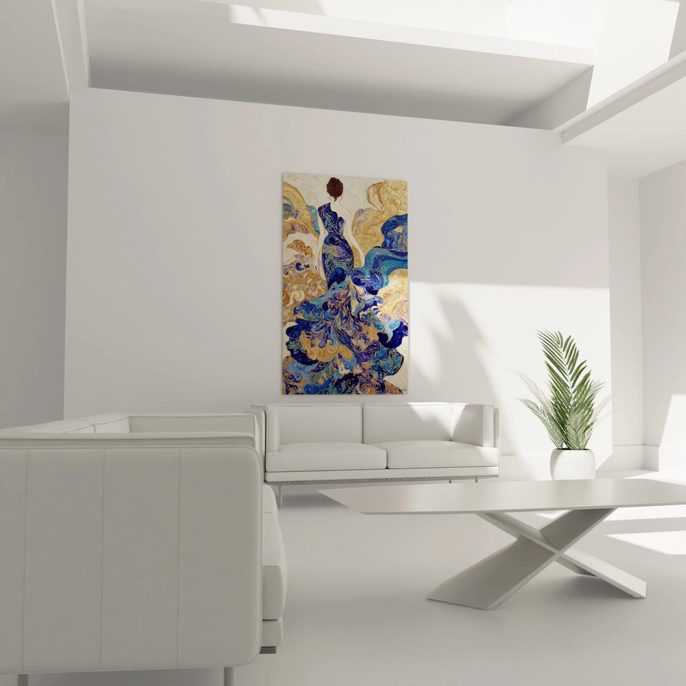 Ce tableau mural haute couture présente une représentation artistique raffinée d'une silhouette féminine vue de dos, incarnant l'élégance et le mystère. La figure centrale, une femme aux cheveux bruns soigneusement relevés en chignon, porte une robe somptueuse aux tonalités bleues profondes rehaussées de dorures éclatantes. Cette œuvre d'art décorative capture parfaitement l'essence de la beauté féminine intemporelle à travers un style qui mélange art nouveau et influences orientalisantes.