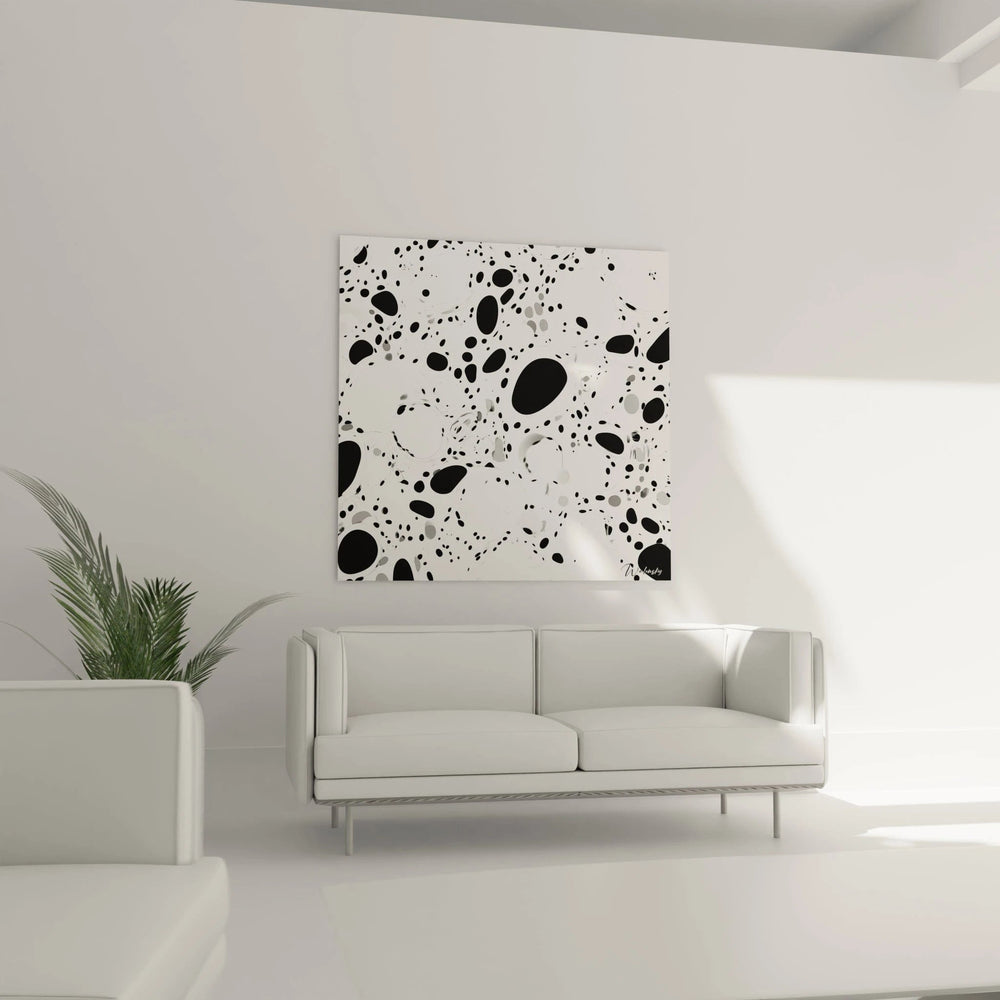 Le tableau moucheté est une œuvre d'art contemporaine caractérisée par un design monochrome où des formes organiques noires et grises sont dispersées sur un fond blanc immaculé. Cette composition abstraite évoque un univers microscopique figé dans le temps, avec des taches de tailles variées créant un rythme visuel dynamique et équilibré.