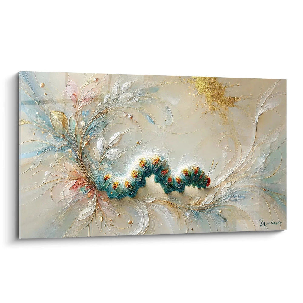 Chaque regard posé sur ce tableau vous transporte dans un univers d’harmonie et de douceur. Les courbes fluides de la chenille, rehaussées de teintes bleu profond, or éclatant et beige apaisant, créent une atmosphère lumineuse et élégante. Ces nuances ont été délicatement choisies pour évoquer la majesté discrète d’un ballet naturel, où la grâce se déploie dans les mouvements les plus subtils.