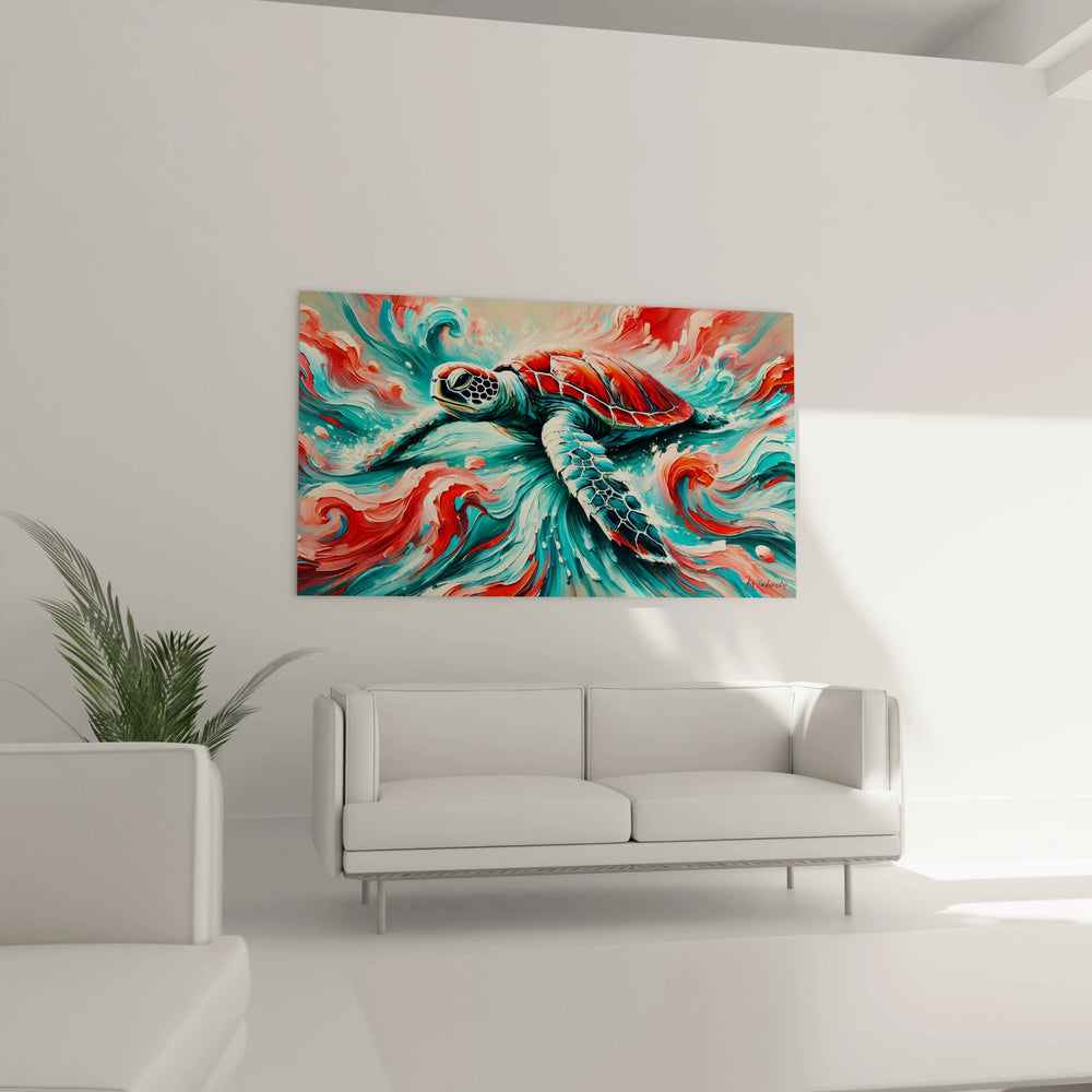 En contemplant ce tableau, vous êtes immédiatement transporté au bord de l’eau, là où les vagues tourbillonnantes dessinent des arabesques rouges et bleues qui s’entrelacent autour de la tortue. Cette danse des courants évoque la puissance dynamique de l’océan, tandis que la présence sereine de la tortue symbolise la sagesse et l’endurance. Chaque détail, chaque nuance de turquoise sur la carapace invite à une immersion totale dans cet univers marin, offrant un véritable apaisement visuel et émotionnel.
