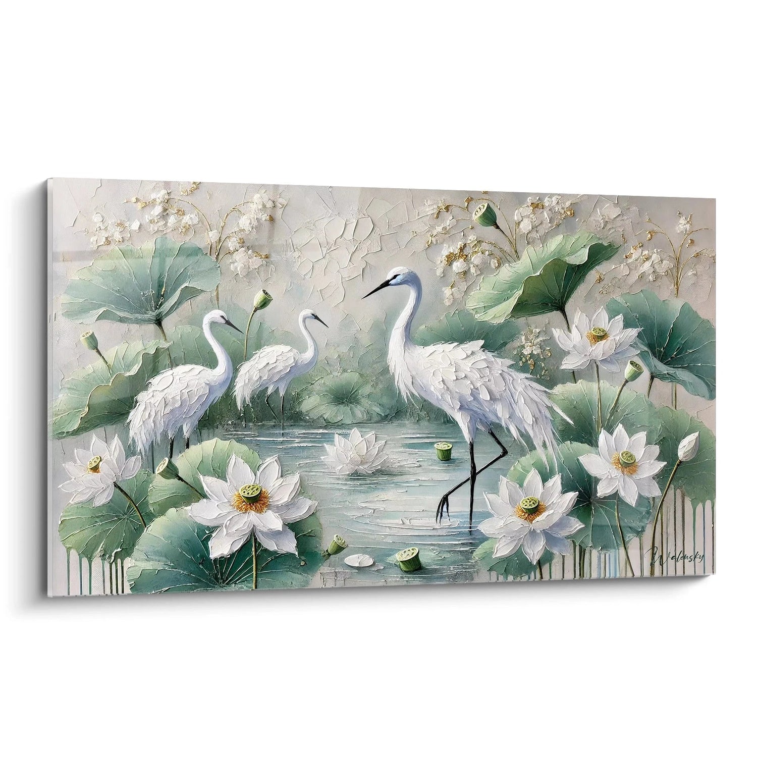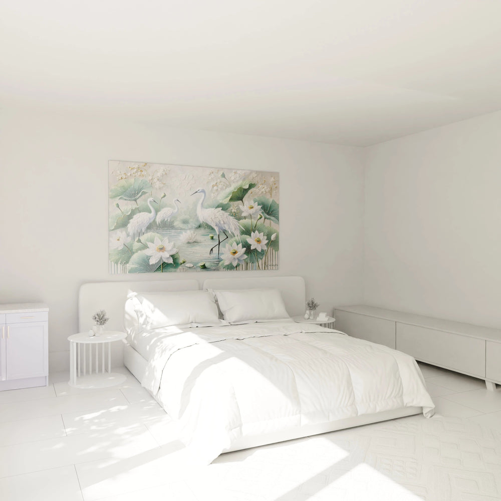 Ce tableau vous plonge dans un univers où les lotus, symboles puissants de pureté, dansent au rythme léger des courants d’eau, accompagnés par la silhouette élégante des grues. Le raffinement des teintes naturelles – blanc immaculé, vert tendre et beige doré – compose une palette qui apaise l’œil et invite au calme intérieur.