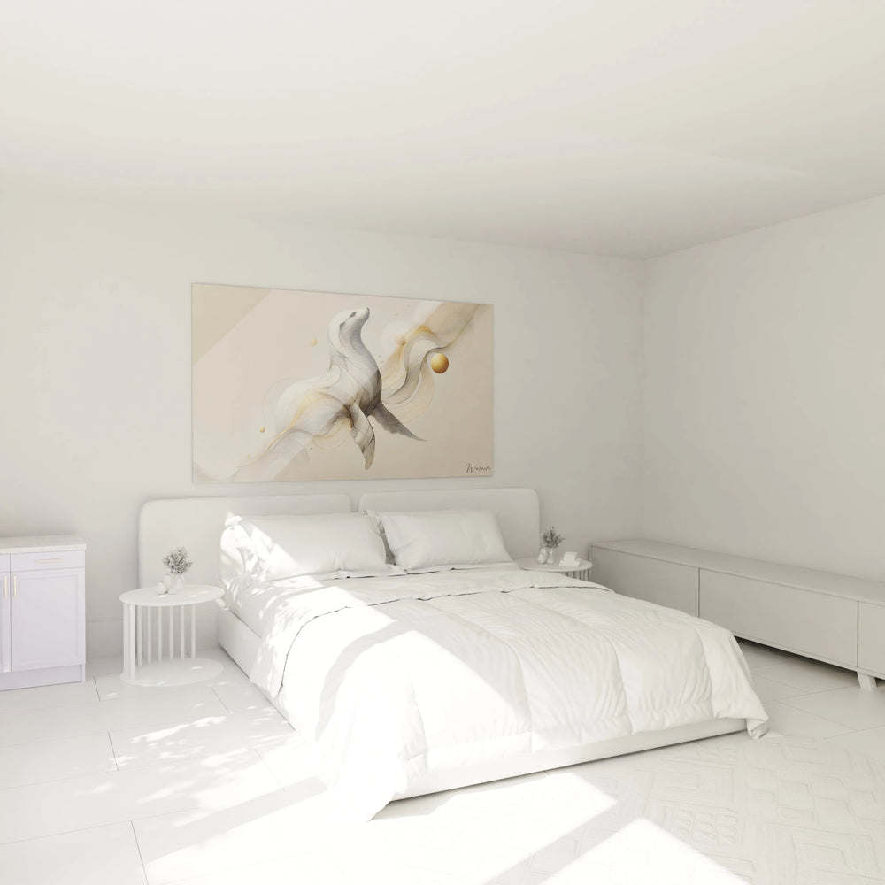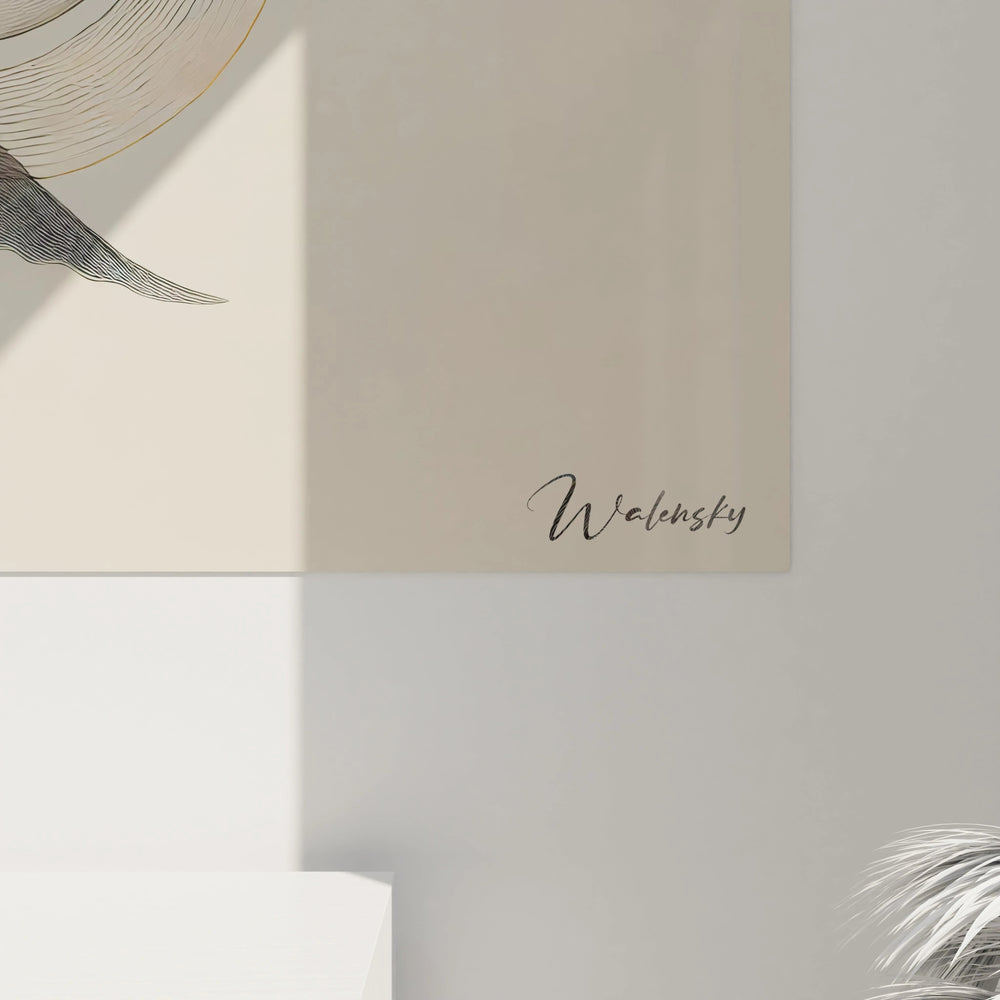 Cette œuvre unique vous transporte au cœur d’un univers où l’eau et l’air composent une danse délicate autour du phoque. Les courbes fluides, dessinées avec une légèreté aérienne, évoquent ce mouvement perpétuel et magique. La palette raffinée mêlant beige doux, or lumineux et gris profond enveloppe votre espace d’une atmosphère paisible et chaleureuse, tout en y insufflant une note sophistiquée et précieuse.