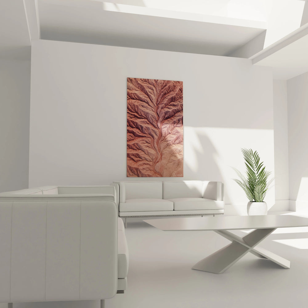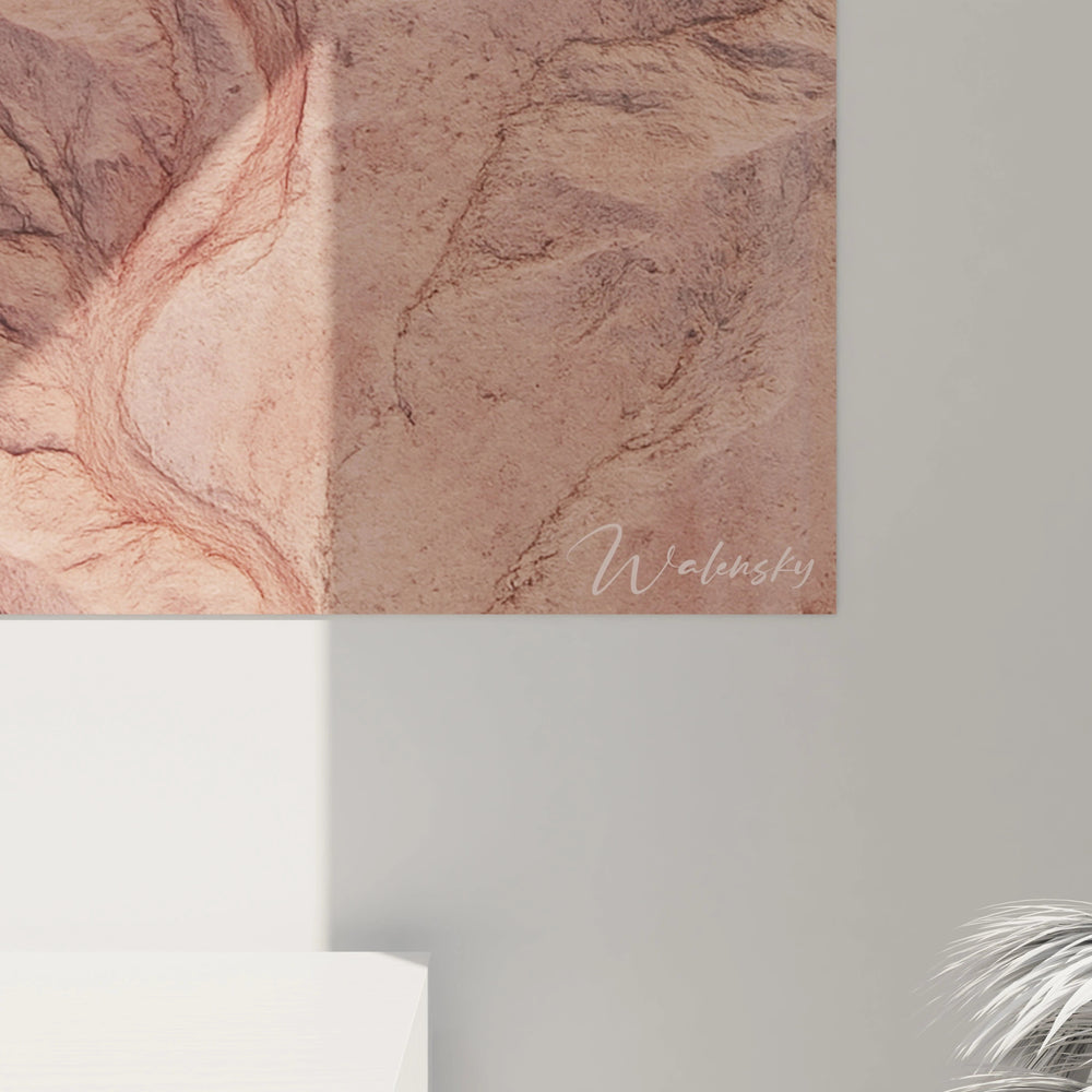 Ce tableau est bien plus qu’une simple décoration murale : c’est un voyage visuel qui vous transporte au cœur de formations géologiques millénaires. Conçu à partir d’une inspiration née lors d’un survol des terres arides, il révèle la subtile ressemblance entre les paysages terrestres et les réseaux organiques de la vie humaine. Chaque contour, chaque crête du relief est modelé minutieusement pour créer un effet de profondeur saisissant, magnifié par une palette raffinée de roses tendres, de bruns chaleureux et de beiges délicats.