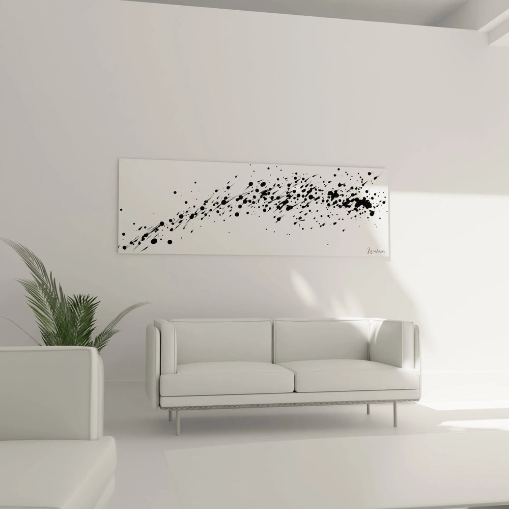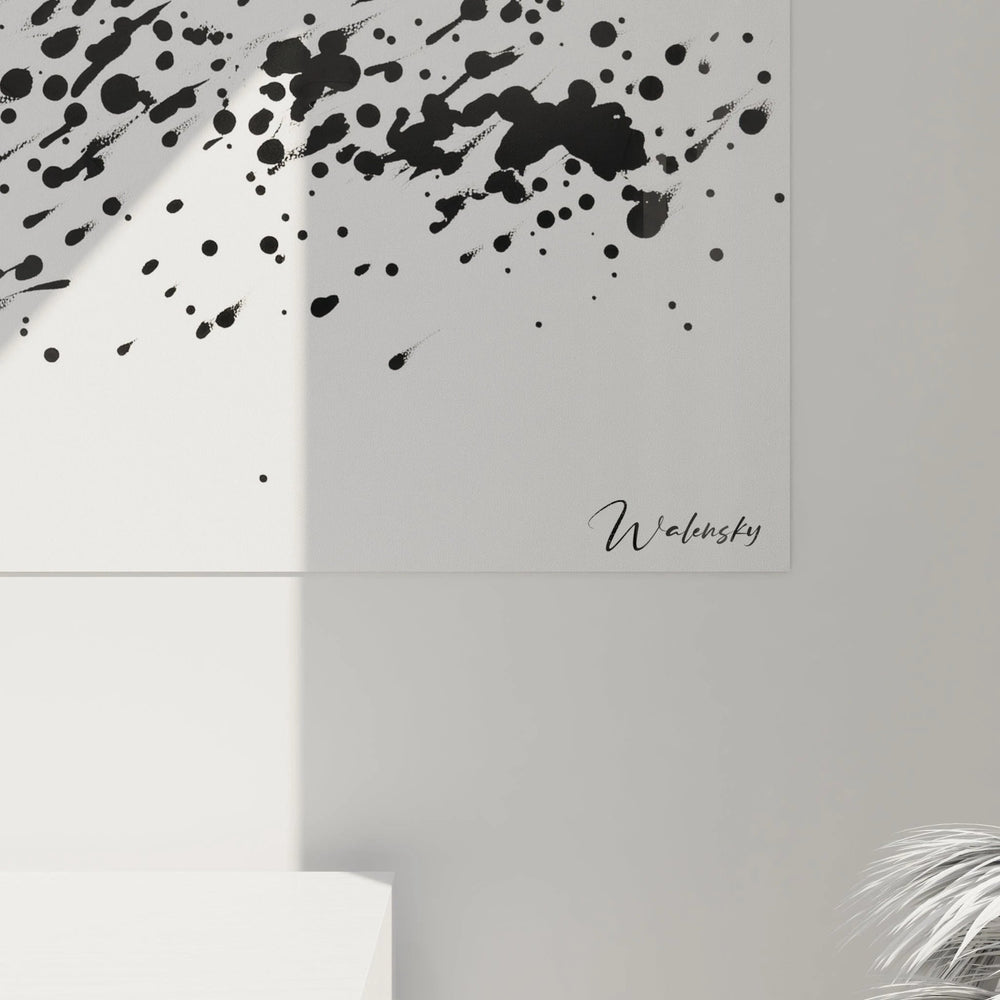 Le choix radical du noir et blanc confère à cette œuvre une intemporalité saisissante. Cette décoration murale monochrome moderne exploite toute la richesse des nuances de gris créées par la dilution naturelle de l'encre. Les contrastes francs entre les zones d'impact dense et les espaces immaculés génèrent une tension visuelle stimulante.