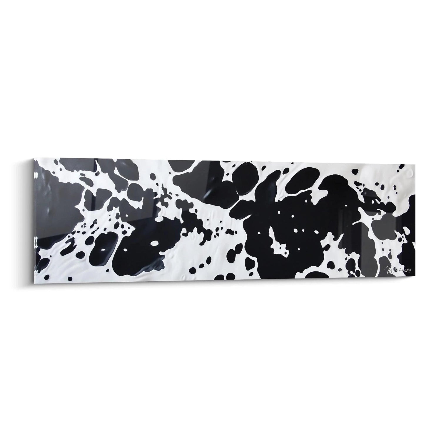 Ce tableau abstrait noir et blanc présente une composition dynamique où les formes organiques semblent exploser dans l'espace. L'œuvre révèle immédiatement son caractère expressif par ses éclaboussures et ses formes fluides qui évoquent un mouvement perpétuel. Ce tableau abstrait contemporain capture l'attention par ses contrastes saisissants entre les zones noires profondes et les espaces blancs lumineux. Les formes irrégulières créent une décoration murale abstraite qui transforme instantanément l'ambiance d'un espace. L'élément distinctif le plus frappant réside dans cette impression de mouvement figé, comme si l'artiste avait capturé un instant d'explosion créative en pleine action.