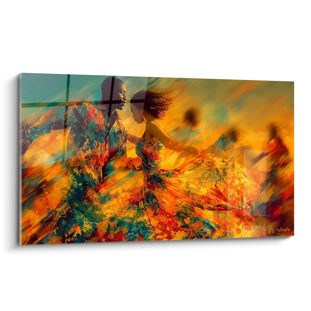 Cette œuvre d'art saisissante capture l'essence du mouvement à travers deux figures en pleine danse, créant un tableau danseurs dynamique traditionnel aux couleurs flamboyantes. Les personnages semblent fusionner avec un arrière-plan composé de teintes chaudes et vibrantes, créant une harmonie visuelle extraordinaire. Le tableau danseurs mouvement fluide révèle une technique artistique sophistiquée où les corps en mouvement se mélangent aux nuances dorées et turquoise. Cette décoration murale danseurs énergique dégage une puissance émotionnelle immédiate, transportant l'observateur dans un univers de rythme et de passion. L'œuvre se distingue par sa capacité à traduire le mouvement en couleurs pures, créant une expérience visuelle immersive unique.