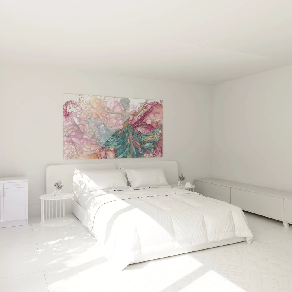 Cette œuvre d'art captivante présente une tableau danseuse aux mouvements fluides, évoluant dans un univers onirique aux tonalités roses et turquoises. La figure centrale, représentant une femme aux traits délicats, se déploie avec grâce dans un tourbillon de tissus vaporeux. Les tableau danseuse mouvement fluide se caractérisent par une gestuelle expressive où chaque courbe du corps raconte une histoire de liberté et d'harmonie. L'artiste a su capturer l'essence même de la danse à travers cette décoration murale danseuse élégante qui transforme l'espace en véritable théâtre visuel. Cette œuvre unique révèle des détails fascinants qui ne cessent de surprendre l'observateur attentif.