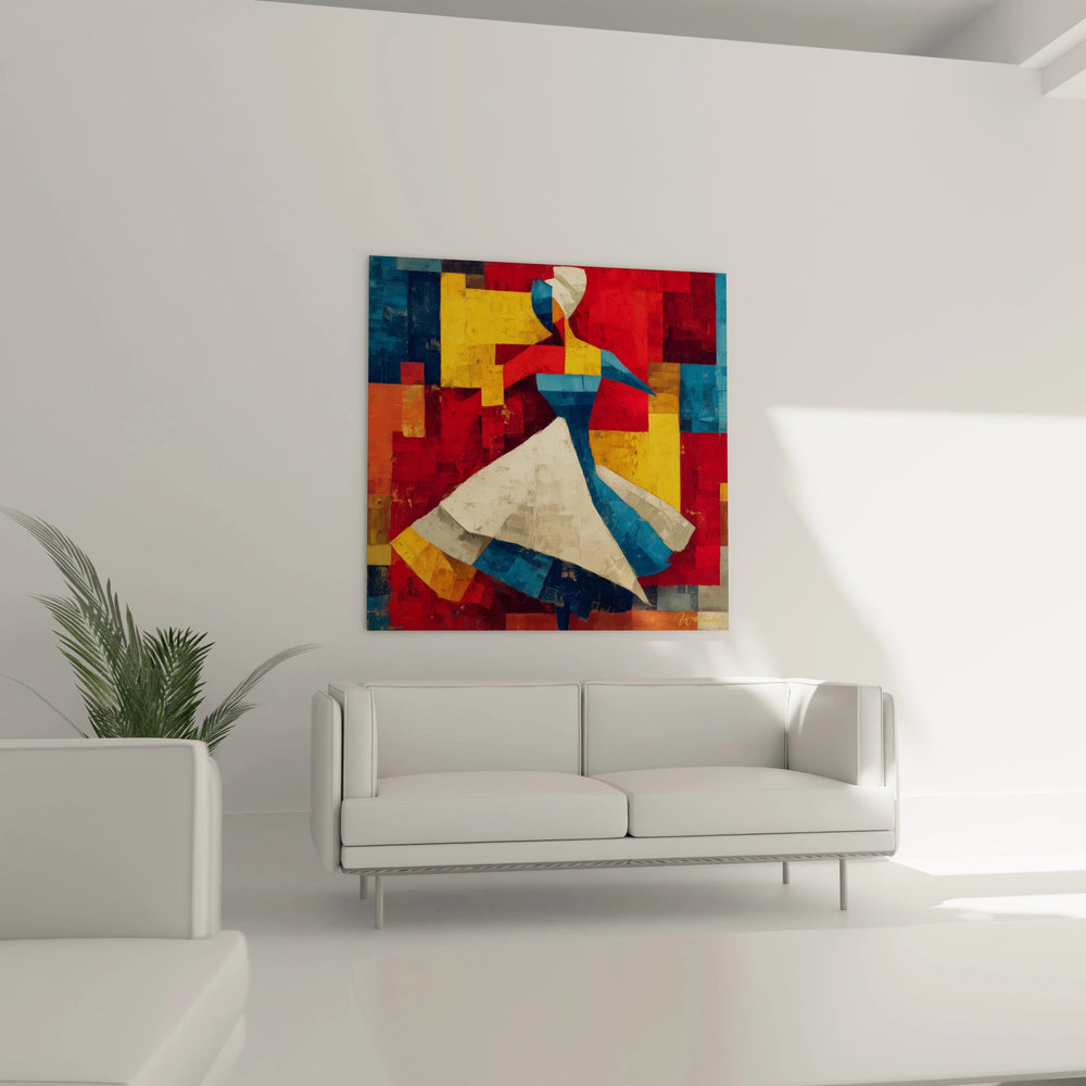 Ce tableau danseuse présente une composition géométrique saisissante où la figure féminine émerge d'un arrière-plan de formes rectangulaires colorées. L'œuvre capture le mouvement d'une danseuse en pleine action, avec une robe blanche ample qui tourbillonne autour de son corps bleu stylisé. Les couleurs primaires dominent cette création artistique : rouge vermillon, jaune ocre et bleu cobalt se mélangent harmonieusement. Le tableau danseuse abstraite géométrique révèle immédiatement son caractère moderne et expressif. La technique de superposition des formes crée une profondeur visuelle remarquable, transformant cette décoration murale danseuse en véritable point focal.
