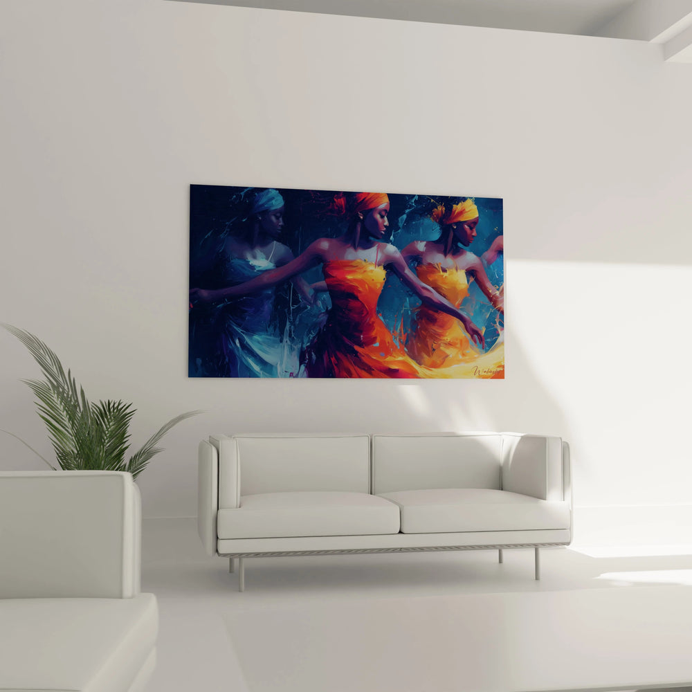 Cette œuvre d'art captivante présente un tableau danseuses aux mouvements gracieux et expressifs. L'artiste a su créer une composition dynamique où trois femmes aux turbans colorés évoluent dans un rythme visuel saisissant. Ce tableau danseuses colorées se distingue par sa palette chromatique audacieuse mêlant les oranges flamboyants aux bleus profonds. Les silhouettes féminines semblent portées par une énergie collective, leurs corps ondulant dans une harmonie parfaite. Cette décoration murale danseuses apporte une dimension culturelle forte à tout espace de vie grâce à son dynamisme visuel remarquable.
