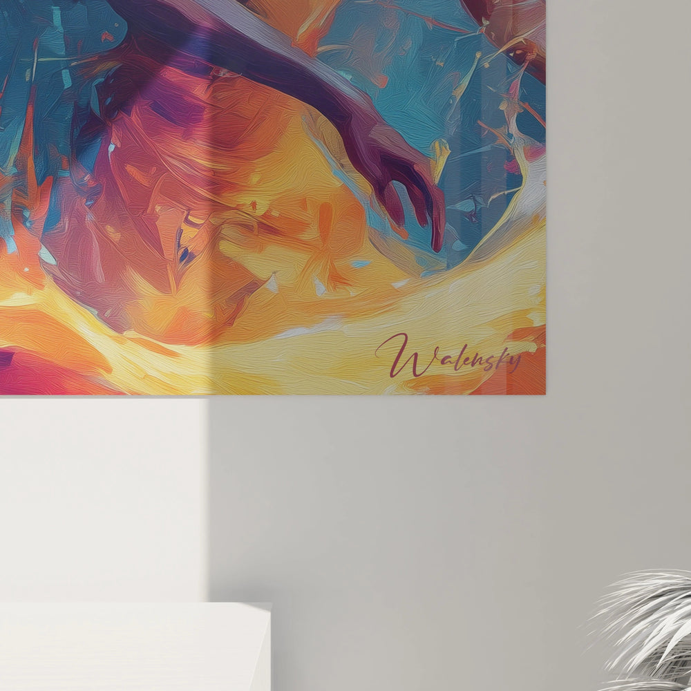 Cette harmonie chromatique confère à ce tableau danseuses multicolores une vibration visuelle intense. Les couleurs chaudes projettent les figures vers l'avant tandis que les bleus profonds créent la profondeur nécessaire. Cette art mural danseuses vibrantes exploite parfaitement les contrastes complémentaires pour créer un impact visuel maximal tout en conservant une cohérence esthétique remarquable.