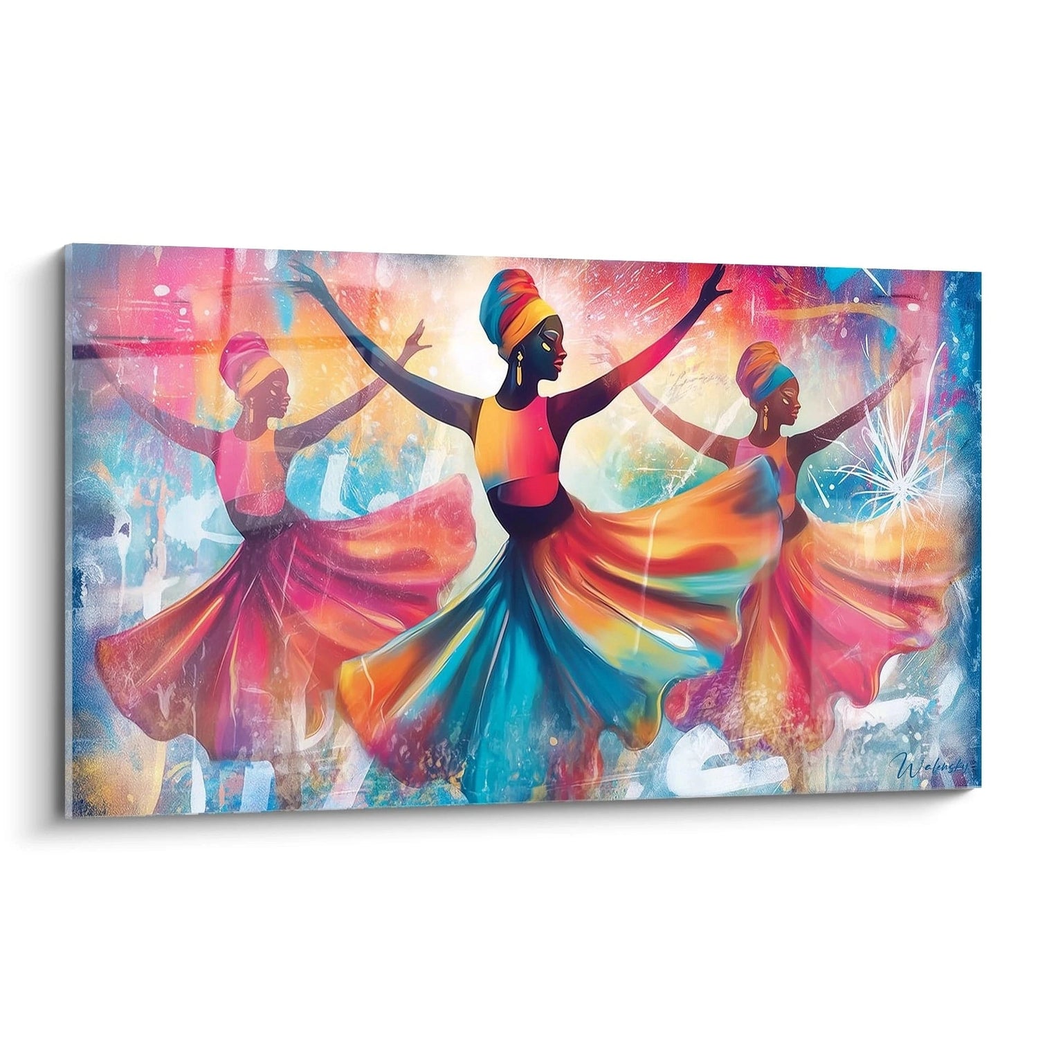 Cette œuvre d'art contemporaine présente trois tableau danseuses africaines colorées dans un mouvement de célébration collective. Les figures féminines se distinguent par leurs silhouettes élancées aux bras levés vers le ciel, créant une composition dynamique et harmonieuse. Le tableau danseuses traditionnelles capture l'essence de la danse africaine à travers des gestes expressifs et des postures gracieuses. Les coiffes traditionnelles colorées surmontent chaque danseuse, ajoutant une dimension culturelle authentique à l'ensemble. Cette décoration murale danseuses évoque immédiatement la joie et la spiritualité des célébrations africaines ancestrales.