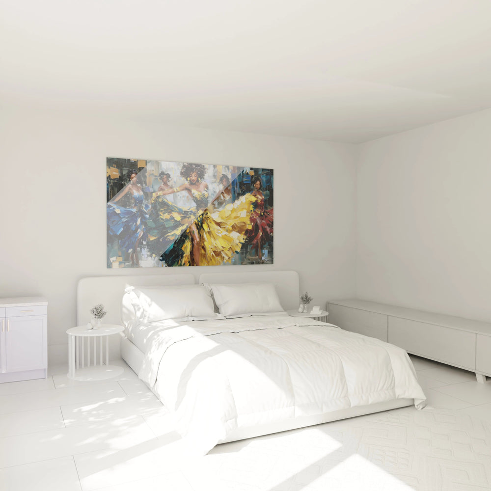 La composition de ce tableau danseuses tourbillonnantes s'organise autour d'un équilibre parfaitement orchestré. La danseuse centrale, vêtue de jaune et vert, occupe le point focal avec sa posture élégante et son regard baissé. Les quatre autres figures l'encadrent harmonieusement, créant un rythme visuel qui guide l'œil de gauche à droite. L'arrière-plan géométrique en tons neutres contraste subtilement avec les robes fluides, permettant aux personnages de ressortir avec intensité. Cette art mural danseuses exploite habilement la perspective frontale pour maximiser l'impact des mouvements des tissus. Les lignes de force convergent naturellement vers le centre, renforçant l'unité compositionnelle de l'ensemble.