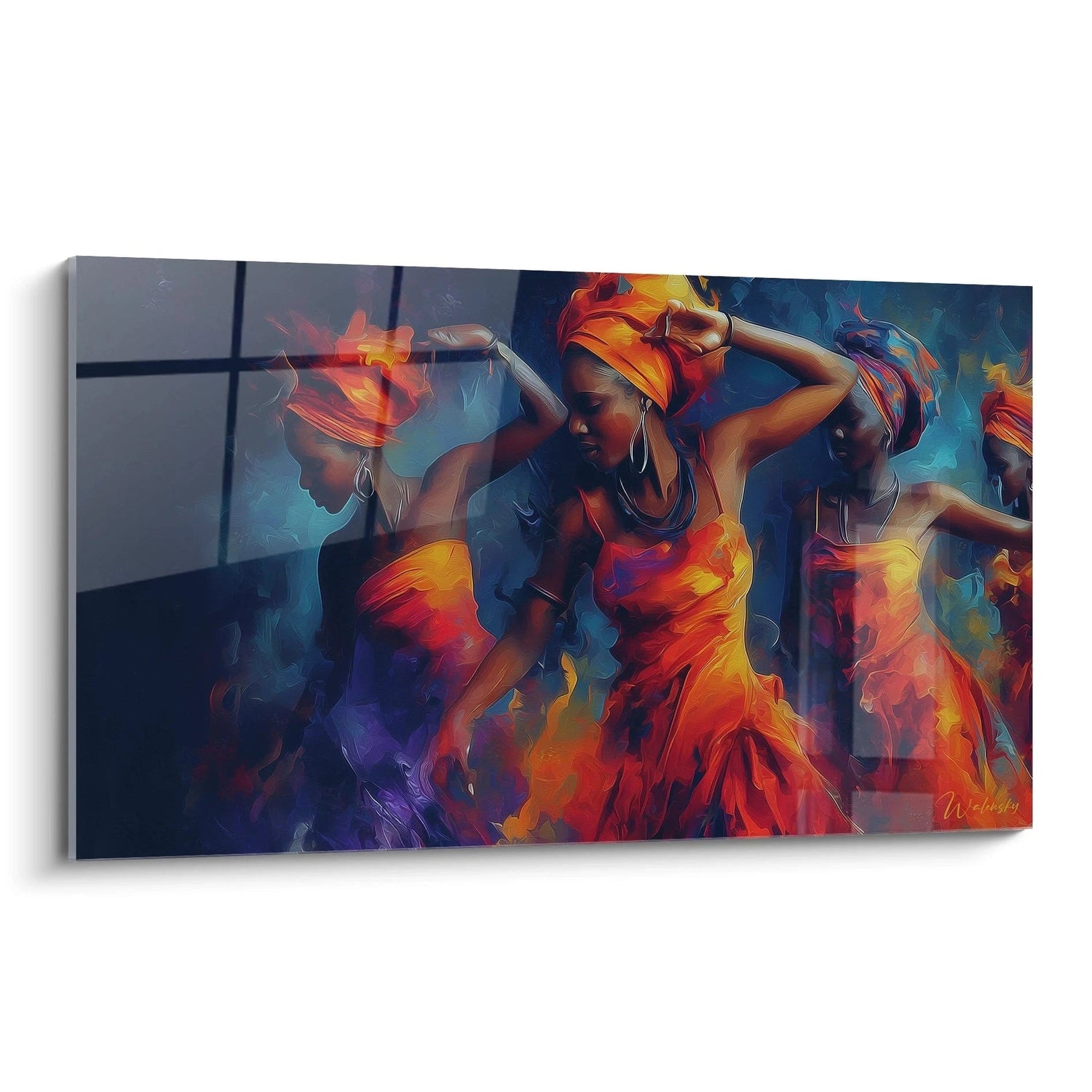 Cette harmonie chromatique complémentaire génère une tension visuelle stimulante, où la chaleur des oranges contraste avec la fraîcheur des bleus. Le tableau danseuses couleurs vibrantes utilise ces contrastes pour accentuer le mouvement et créer une profondeur émotionnelle intense, évoquant la passion et l'énergie de la danse africaine.