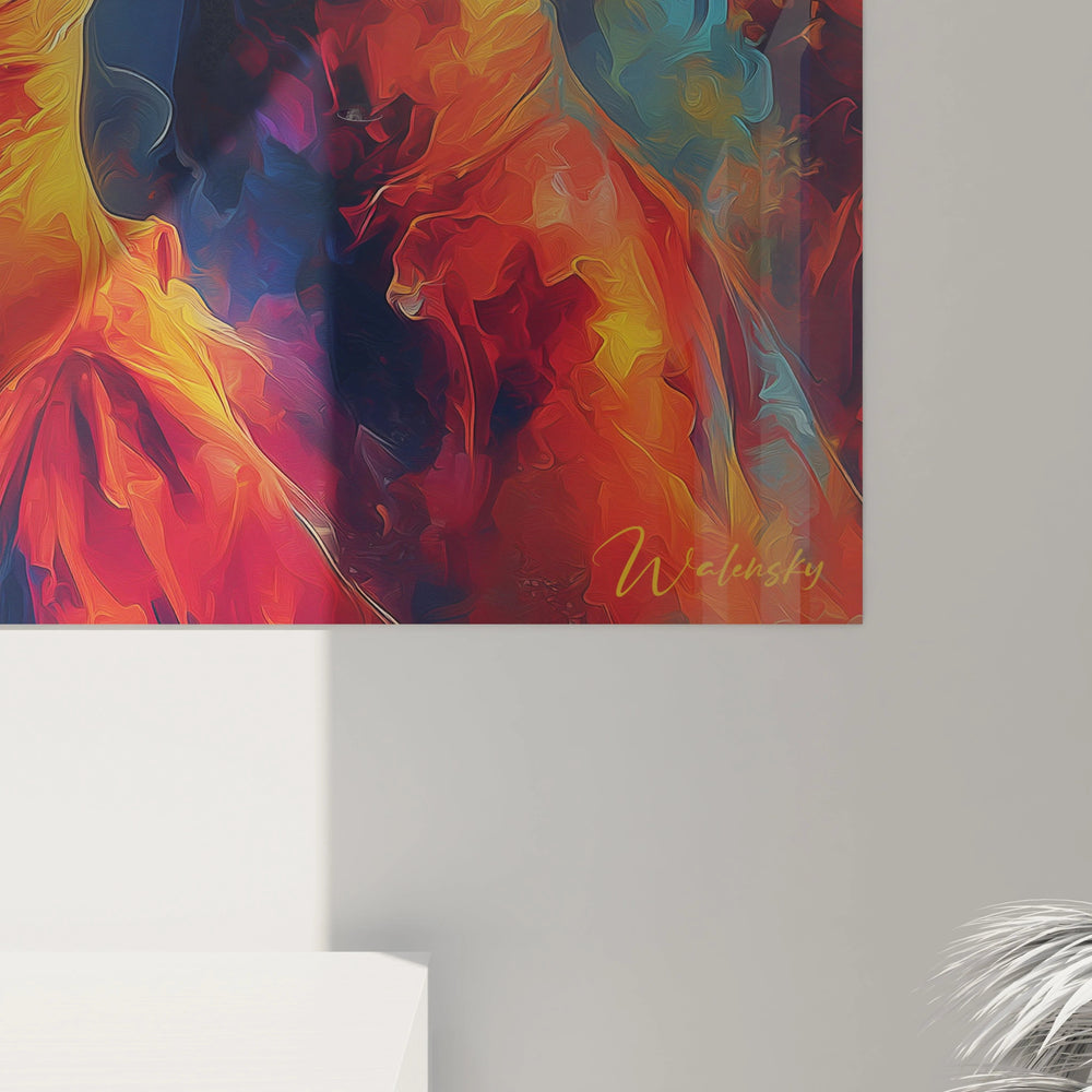 La palette chromatique de ce tableau danseuses flamme orange s'organise autour d'un contraste saisissant entre les tons chauds et froids. Les couleurs dominantes révèlent :