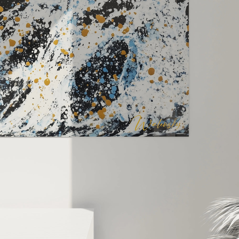 La palette chromatique de ce tableau dauphin or et noir repose sur un contraste saisissant entre les tons chauds et froids. Les nuances dorées dominent le corps du mammifère, allant du jaune lumineux aux reflets ambrés plus profonds. Cette art mural dauphin doré intègre des touches de gris anthracite qui structurent les volumes et apportent de la profondeur. Les éclaboussures blanches et argentées ponctuent la composition de notes lumineuses, créant des points d'accroche visuels.