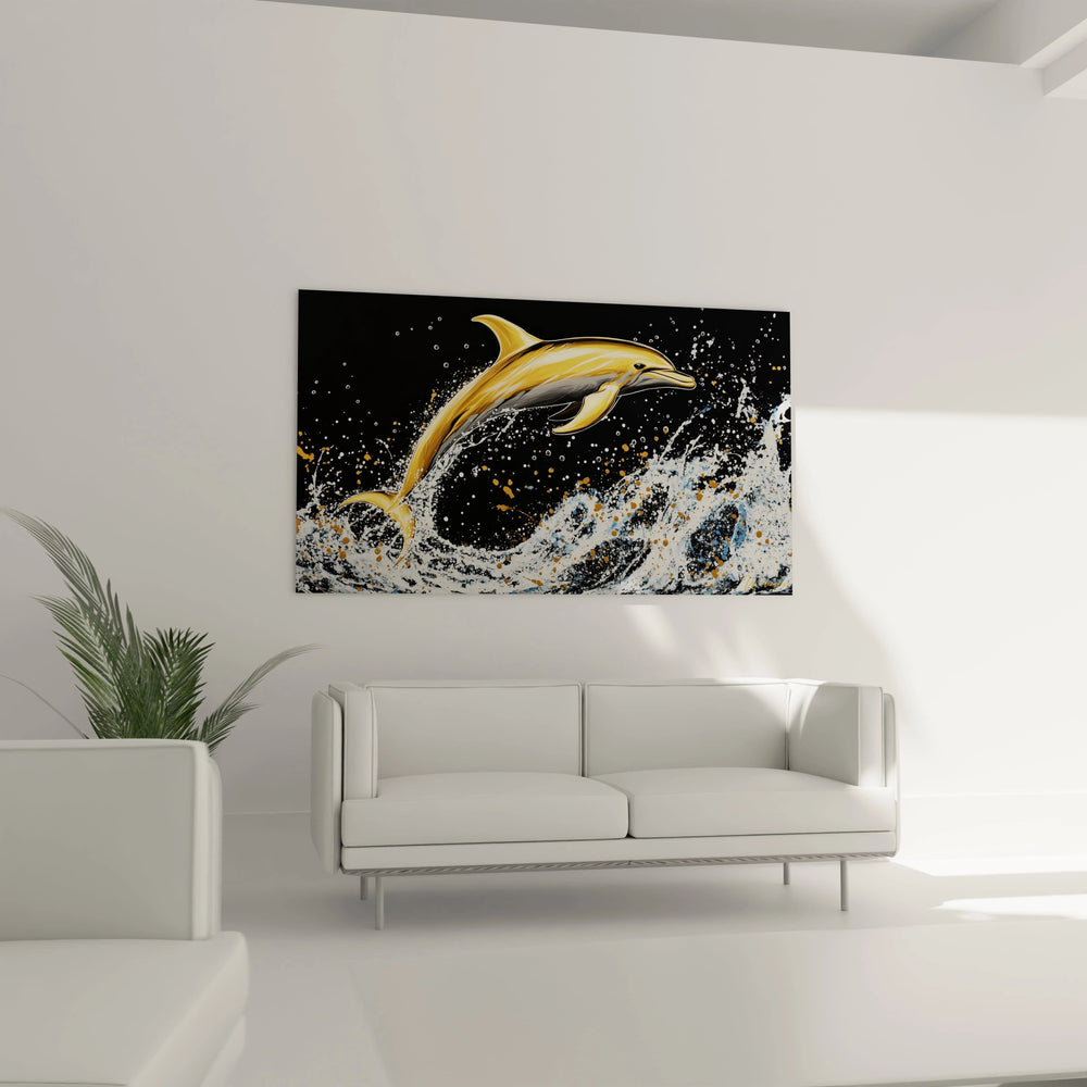 Ce tableau dauphin présente un mammifère marin majestueux aux teintes dorées éclatantes, capturé dans un mouvement ascendant spectaculaire. L'œuvre révèle un tableau dauphin doré dynamique où l'animal semble jaillir des profondeurs avec une grâce naturelle saisissante. Les éclaboussures blanches et argentées créent un contraste dramatique contre le fond noir profond, accentuant la puissance du mouvement. Cette décoration murale dauphin transmet immédiatement une sensation de liberté et d'énergie vitale, transformant l'espace par sa présence imposante et sa luminosité naturelle.