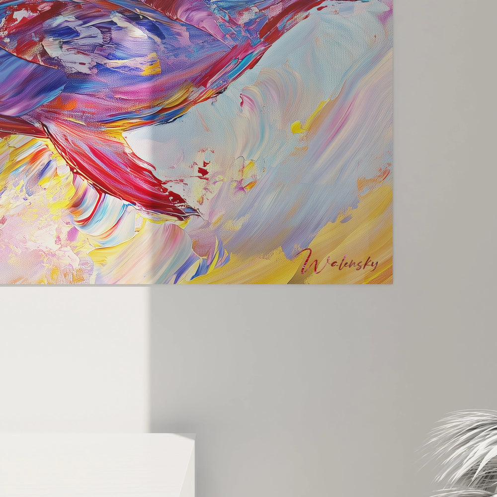 Cette œuvre se démarque par sa capacité à transformer des mammifères marins en véritables flammes colorées évoluant dans un océan abstrait. Le tableau dauphin artistique original ne cherche pas la reproduction fidèle mais l'interprétation poétique de la vie marine. Les dauphins semblent danser plutôt que nager, leurs corps ondulant comme des rubans colorés dans l'espace pictural. Cette approche unique confère à l'œuvre une dimension onirique rare dans la représentation animalière. La signature de l'artiste, discrètement placée en bas à droite, authentifie cette art mural dauphin signature qui révèle une personnalité artistique affirmée et reconnaissable.