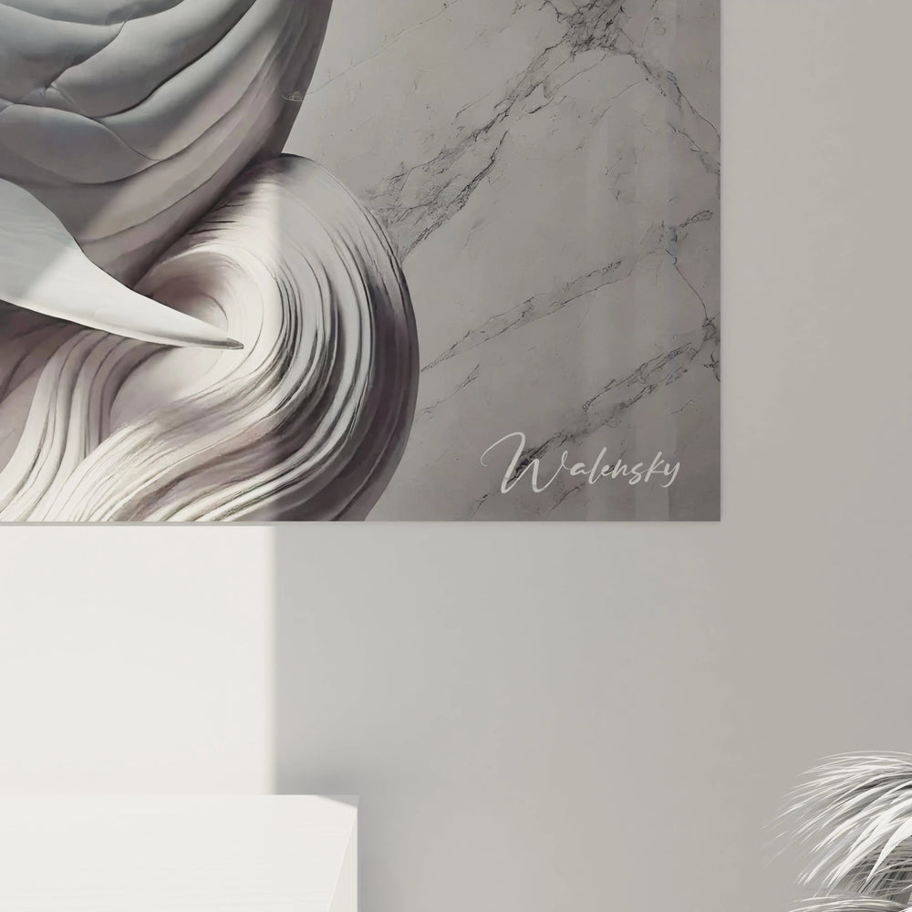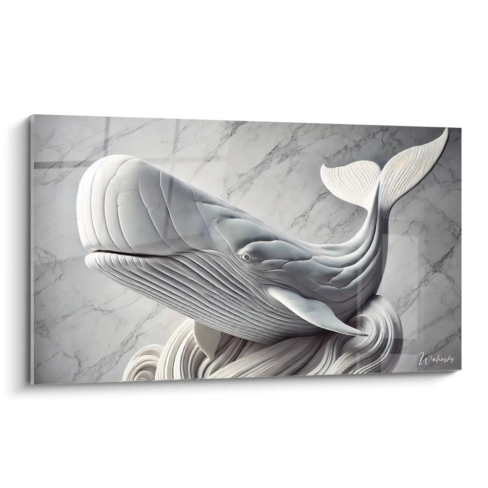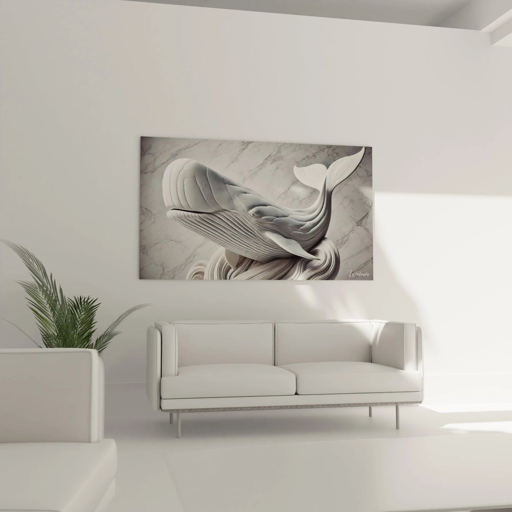 Chaque courbe de ce tableau est soigneusement sculptée dans une texture marbrée aux nuances de blanc, gris et argent, évoquant la légèreté et la sérénité d’un ballet aquatique. En posant le regard dessus, vous ressentez presque la fraîcheur de l’eau, la douceur du mouvement fluide du cachalot, et cette ambiance apaisante qui invite à la méditation intérieure. Ce tableau crée une atmosphère enveloppante, où le temps semble suspendu, offrant un véritable havre de paix dans votre intérieur.