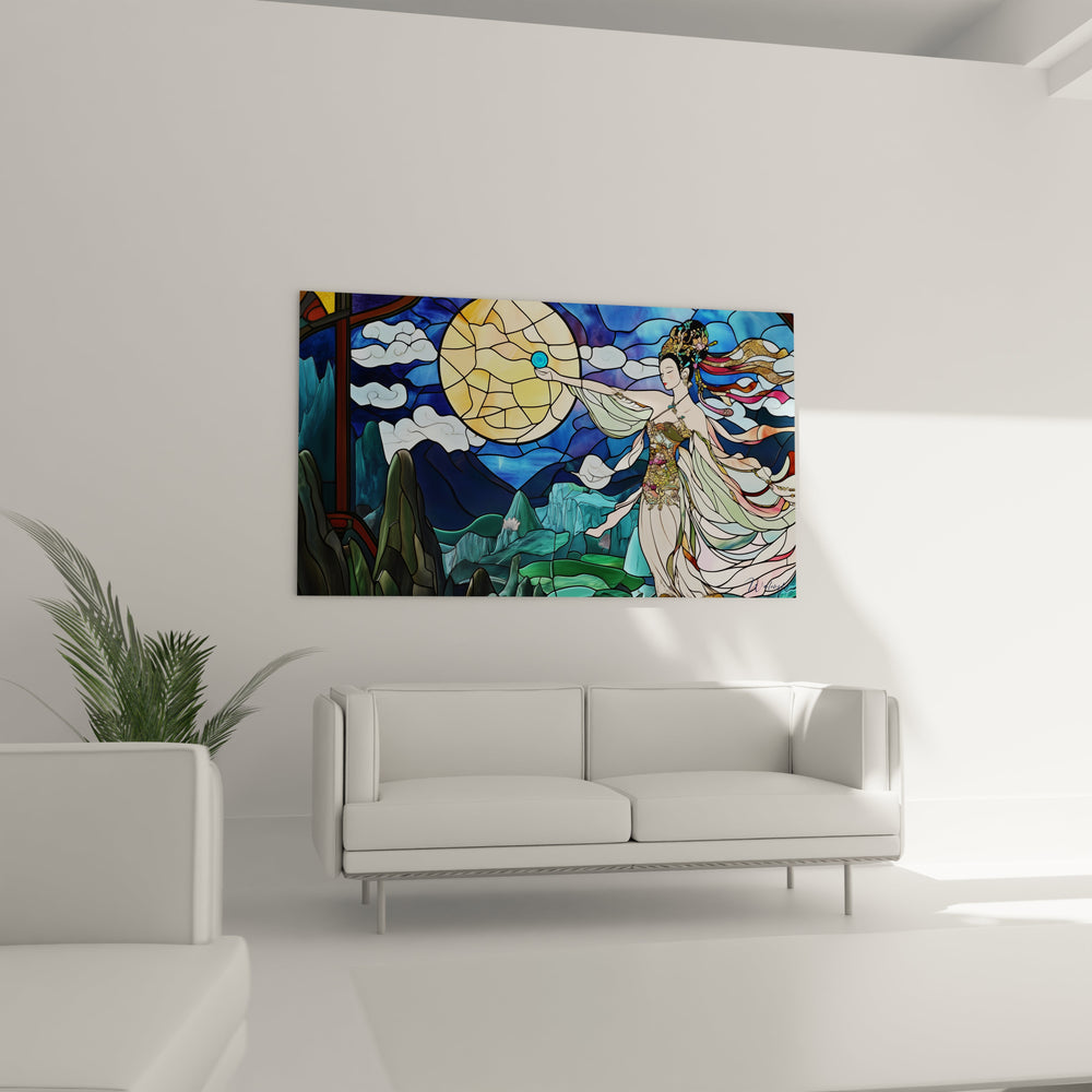 Ce tableau a été conçu comme une passerelle entre le tangible et l’éthéré. Inspiré des légendes asiatiques et des paysages montagneux baignés d’une lumière mystique, il restitue le pouvoir apaisant et profond de la nature. En observant la déesse lunaire, vous ressentirez aussitôt ce moment suspendu, cette rencontre magique où la lumière caresse doucement le verre coloré, révélant un univers empreint de paix et de sérénité.