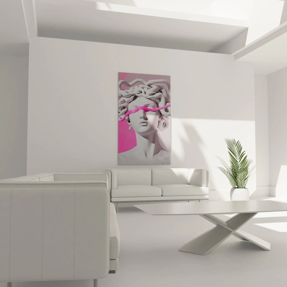 L'élément distinctif qui attire immédiatement l'attention est ce bandeau rose fluorescent qui masque le regard de la figure mythologique, créant un dialogue fascinant entre l'art classique et les tendances contemporaines. La finesse des détails sculpturaux et la pureté des lignes confèrent à ce tableau statue une présence imposante malgré sa simplicité chromatique.