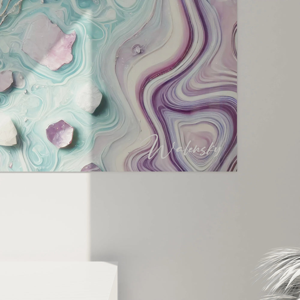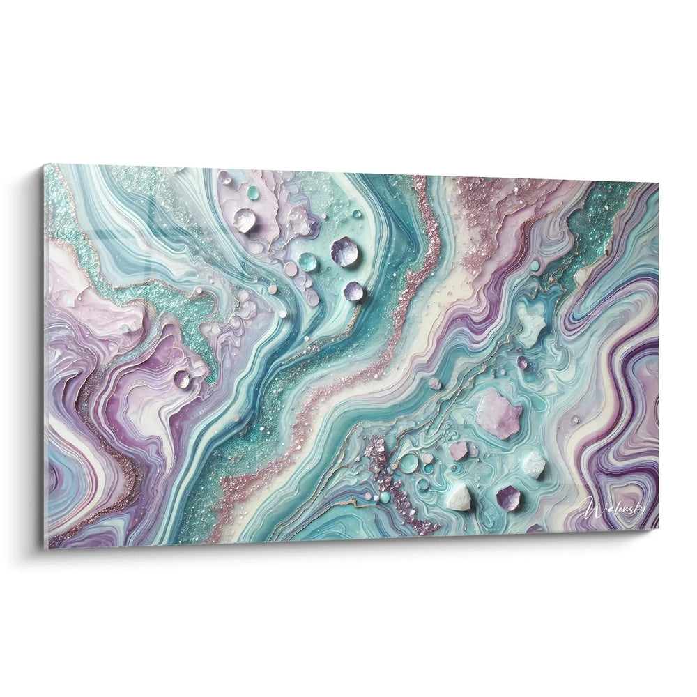Chaque détail de ce tableau évoque un monde où les éléments naturels s’entremêlent avec finesse et grâce. Le rendu époxy sublime les ondulations essentielles de l’eau, donnant vie à des vagues pastel, douces et apaisantes, que l’on peut presque sentir caresser la peau. Des touches scintillantes, semblables à des éclats de cristal, apportent une profondeur lumineuse qui capte le regard et l’imagination.