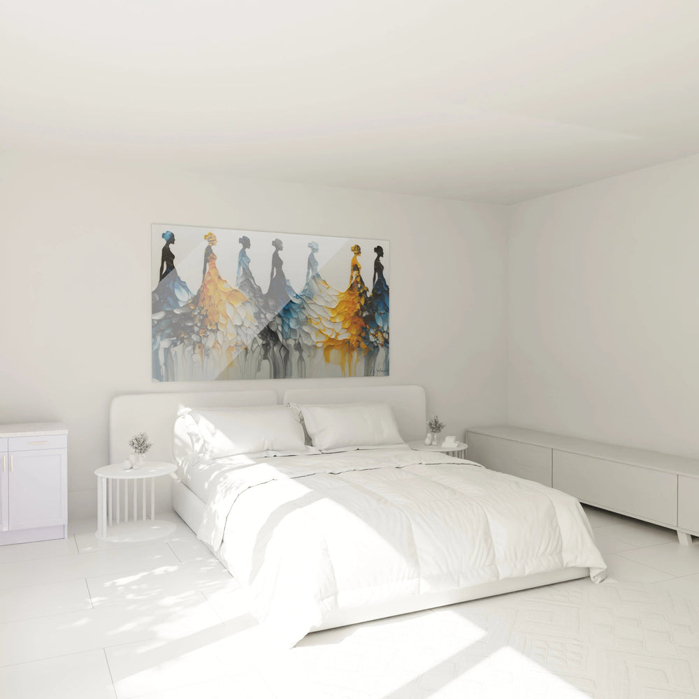 Ce tableau mural haute couture présente une composition artistique exceptionnelle mettant en scène sept silhouettes féminines dans une procession élégante et mystérieuse. L'œuvre se distingue par sa représentation sophistiquée de femmes en mouvement, chacune portant une robe longue aux traînes spectaculaires qui se métamorphosent en coulées organiques fascinantes. Les silhouettes, finement ciselées, évoluent dans un ballet harmonieux sur un fond blanc immaculé qui accentue la pureté de la composition.