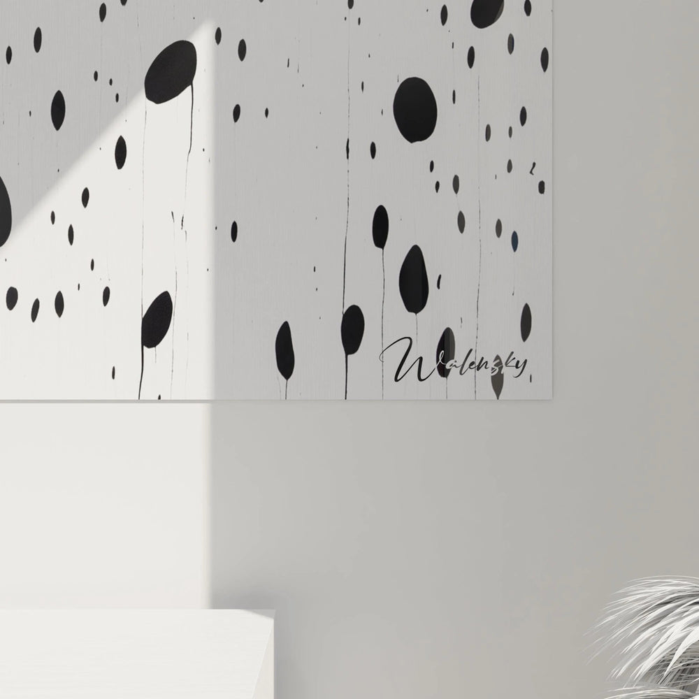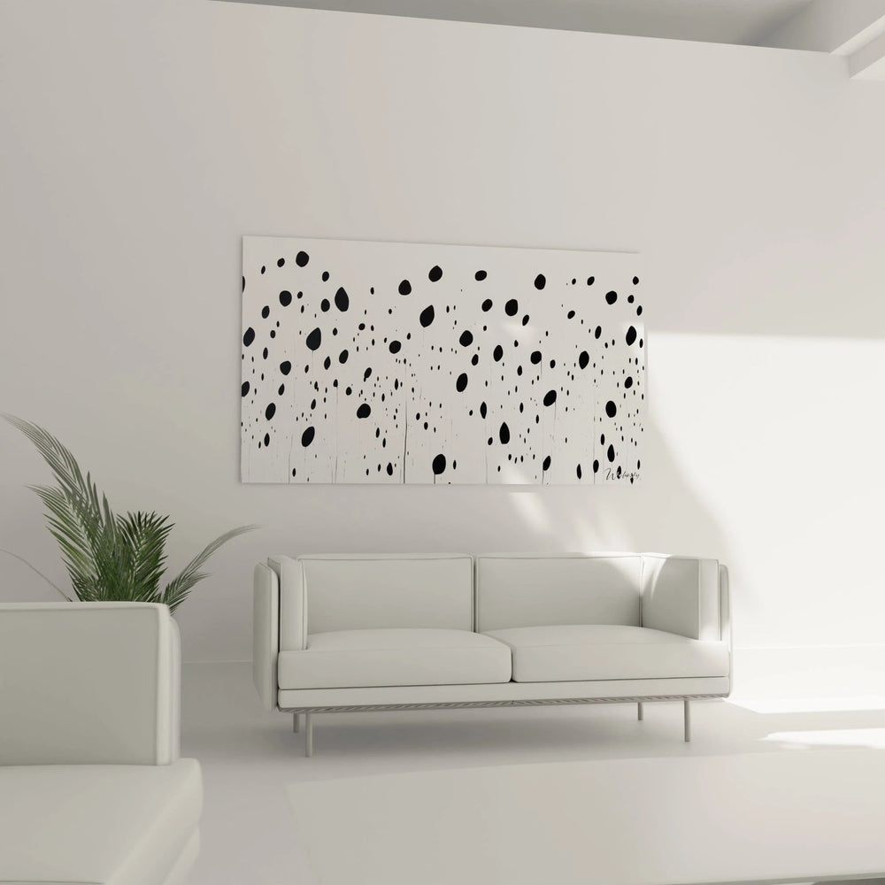 Ce tableau gouttes se distingue par sa composition minimaliste révolutionnaire, où des taches noires de différentes dimensions flottent sur un fond d'un blanc immaculé. L'œuvre présente une distribution organique de ces éléments graphiques, créant un rythme visuel hypnotique qui évoque immédiatement la beauté naturelle d'une averse printanière. La décoration murale gouttes contemporaine offre une première impression saisissante de mouvement suspendu, où chaque forme semble capturer un instant figé dans le temps. L'aspect le plus distinctif réside dans cette capacité à transformer des formes simples en une expérience visuelle complexe et méditative, rendant ce tableau gouttes minimaliste véritablement unique dans l'art contemporain.