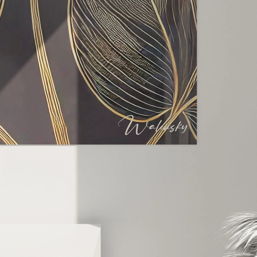 Chaque courbe, chaque nervure de ce tableau reflète la minutie avec laquelle la nature compose ses merveilles. À travers une palette raffinée mêlant or, bronze et noir profond, cette œuvre capte la lumière et la transforme en une lueur chaleureuse qui semble danser sur les contours des feuilles. Vous apprécierez l’effet presque tactile de ses textures, qui invite à une immersion sensorielle unique, comme si vous pouviez sentir le souffle de la forêt à travers ce tableau.