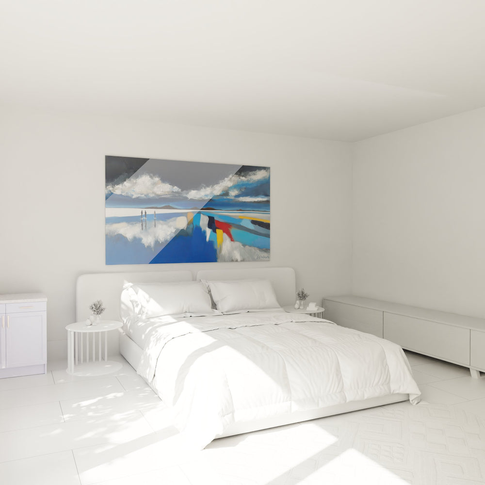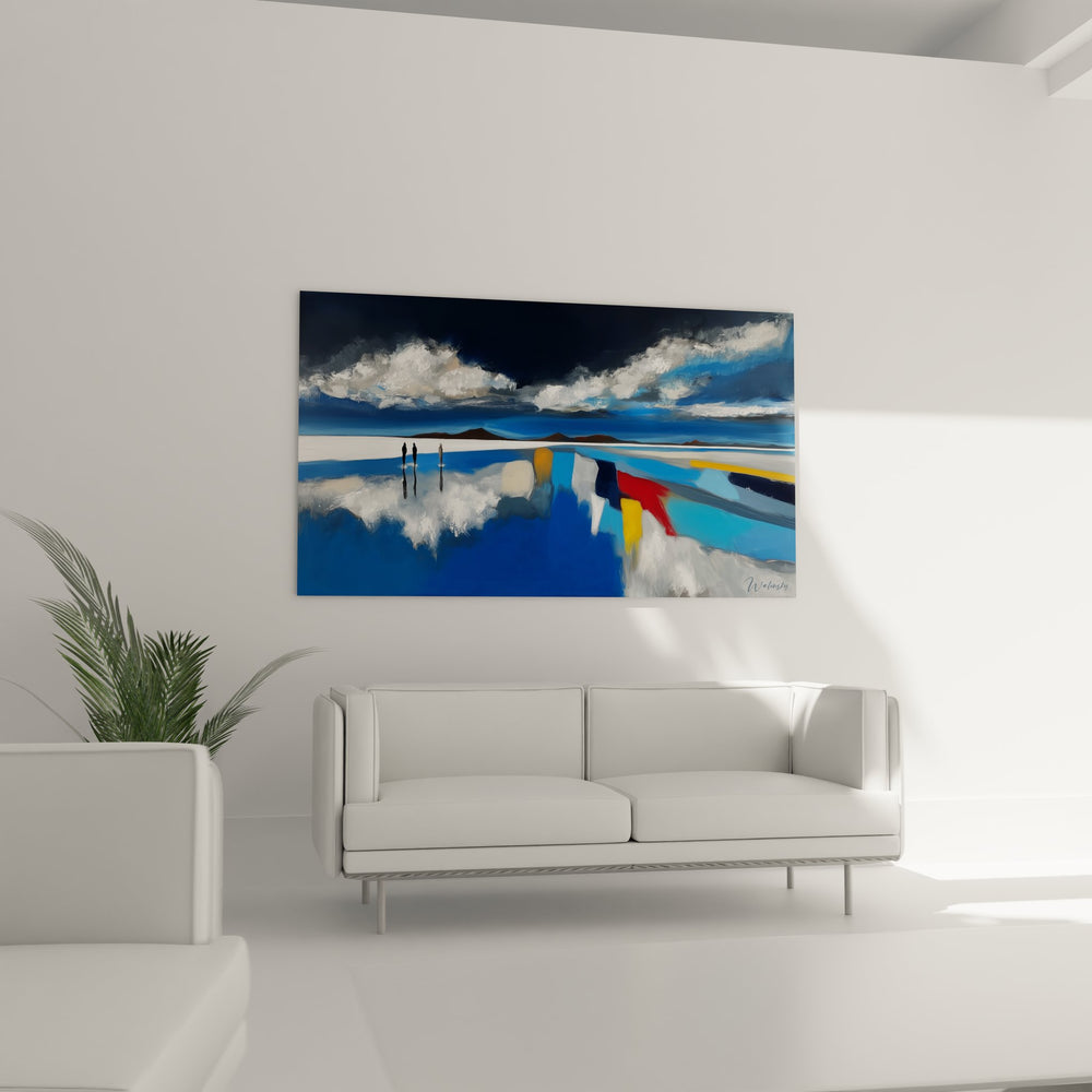 Ce tableau mural désert capture la beauté saisissante d'un désert de sel aux reflets miroir spectaculaires. L'œuvre présente un paysage désertique où dominent les tons bleus profonds et les blancs éclatants, créant un contraste saisissant avec les nuages dramatiques qui traversent le ciel. Au centre de la composition, trois silhouettes humaines se détachent sur l'horizon, apportant une dimension humaine à cette immensité naturelle. Le tableau moderne désert révèle la technique picturale raffinée de l'artiste à travers les reflets parfaits qui doublent chaque élément du paysage dans les eaux cristallines du désert salé. Les couleurs vives - rouge, jaune, orange - des embarcations ou structures se reflètent harmonieusement dans cette surface liquide, créant une symphonie chromatique remarquable. Cette œuvre d'art contemporaine transcende la simple représentation pour offrir une méditation visuelle sur l'infinité des espaces désertiques. Les reflets parfaits transforment ce tableau en un jeu de miroirs naturels où réalité et illusion se confondent, caractéristique des plus beaux déserts de sel de la planète comme le Salar d'Uyuni.