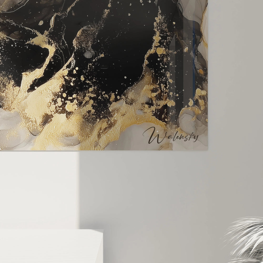 Cette création s'inscrit dans la lignée des grands maîtres de l'art abstrait contemporain, rappelant les œuvres fluides de Jackson Pollock ou les compositions organiques d'Helen Frankenthaler. L'esthétique marbrée évoque également les techniques de l'ebru, art traditionnel turc du papier marbré, revisité dans une approche moderne. Les tons dorés et la sophistication générale font écho aux œuvres de Gustav Klimt, particulièrement sa période dorée. Cette pièce s'inspire aussi des mouvements artistiques contemporains comme l'art fluide haut de gamme et les créations numériques abstraites, positionnant l'œuvre dans une démarche artistique actuelle et innovante.