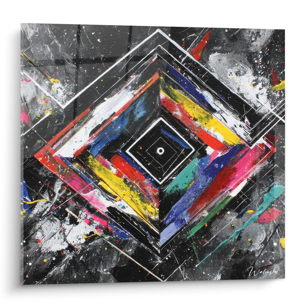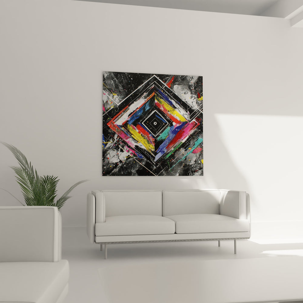 Ce tableau mural géométrique présente une composition saisissante organisée autour d'un motif de diamant concentrique aux formes emboîtées. L'œuvre déploie une structure géométrique parfaitement symétrique où des losanges successifs s'articulent du centre vers la périphérie, créant un effet de profondeur hypnotique. Le cœur de la composition révèle un petit cercle blanc immaculé, point focal entouré de carrés noirs concentriques qui ancrent solidement l'ensemble. Cette peinture abstraite moderne explose ensuite en bandes colorées vibrantes : rouge vermillon, bleu cobalt intense, jaune citron éclatant et rose fuchsia se mélangent dans un chaos contrôlé. L'arrière-plan gris anthracite, parsemé d'éclaboussures et de projections de peinture, évoque l'univers du street art contemporain. Des lignes blanches précises délimitent chaque section géométrique, apportant structure et lisibilité à cette œuvre d'art murale. La technique mixte combine peinture acrylique, projections spontanées et tracés au règle, créant une tension fascinante entre ordre géométrique strict et liberté expressive. Cette décoration murale design transforme l'espace par son dynamisme visuel et sa modernité assumée, parfaite pour les intérieurs contemporains recherchant une pièce maîtresse artistique marquante.