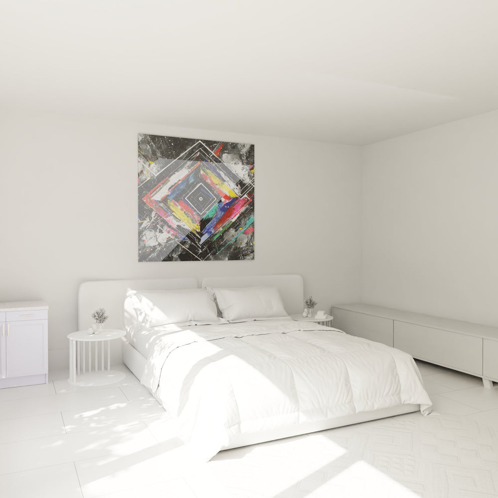 La symbolique de ce tableau géométrique abstrait puise dans l'archétype du diamant, symbole de perfection et d'éternité. La palette chromatique explosive - rouge passion, bleu profondeur, jaune énergie, rose créativité - sur fond gris urbain évoque la dualité entre ordre cosmique et chaos créatif. Cette art mural contemporain interroge l'équilibre entre structure géométrique rigoureuse et expression spontanée, créant une méditation visuelle sur l'harmonie des contraires dans notre époque moderne.
