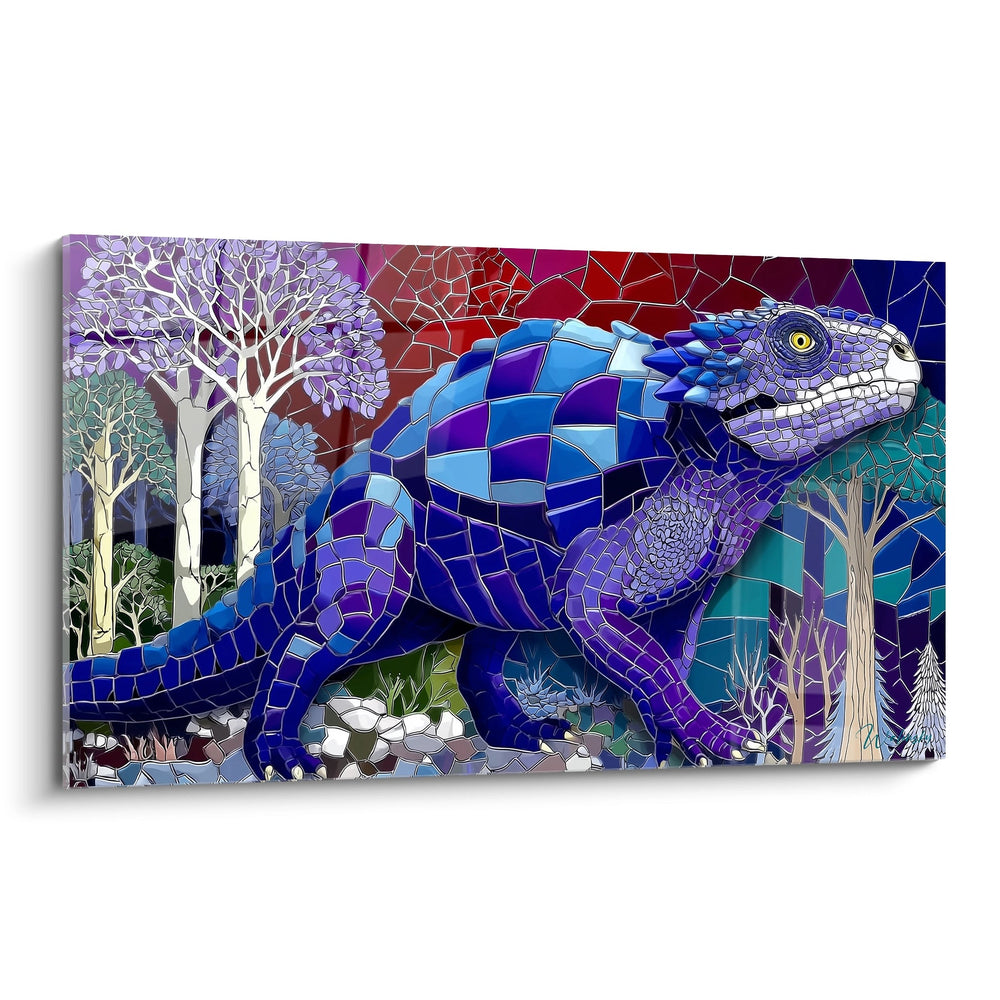 Ce tableau mural dinosaure présente une interprétation artistique saisissante d'un Scutosaurus dans un style mosaïque géométrique contemporain. L'œuvre révèle un reptile préhistorique majestueux aux dominantes bleues et violettes, composé d'une multitude de fragments colorés qui s'assemblent harmonieusement. Le dinosaure art décoratif se dresse dans un environnement stylisé où des arbres aux silhouettes épurées créent un contraste saisissant avec le ciel multicolore. Cette décoration murale préhistorique transforme l'animal antique en une création moderne fascinante, où chaque tesselle de couleur contribue à donner vie à cette créature disparue. Les nuances chromatiques se déclinent du bleu profond au violet intense, créant des jeux d'ombres et de lumières qui sculptent le relief du reptile. Ce tableau géométrique coloré s'inscrit parfaitement dans une démarche artistique contemporaine, alliant l'attrait universel des dinosaures à une esthétique moderne raffinée. L'arrière-plan forestier, traité dans la même technique de mosaïque murale design, complète harmonieusement la composition en créant un écosystème visuel cohérent et captivant.