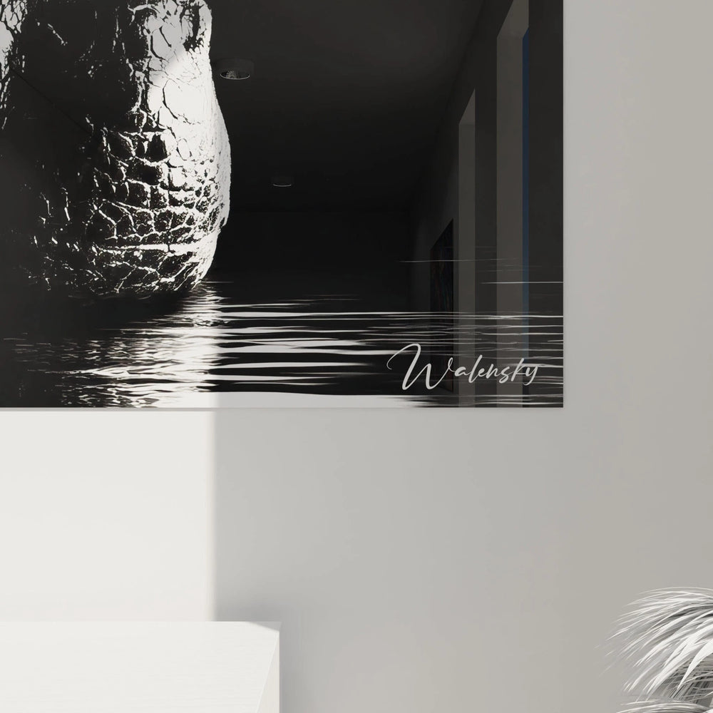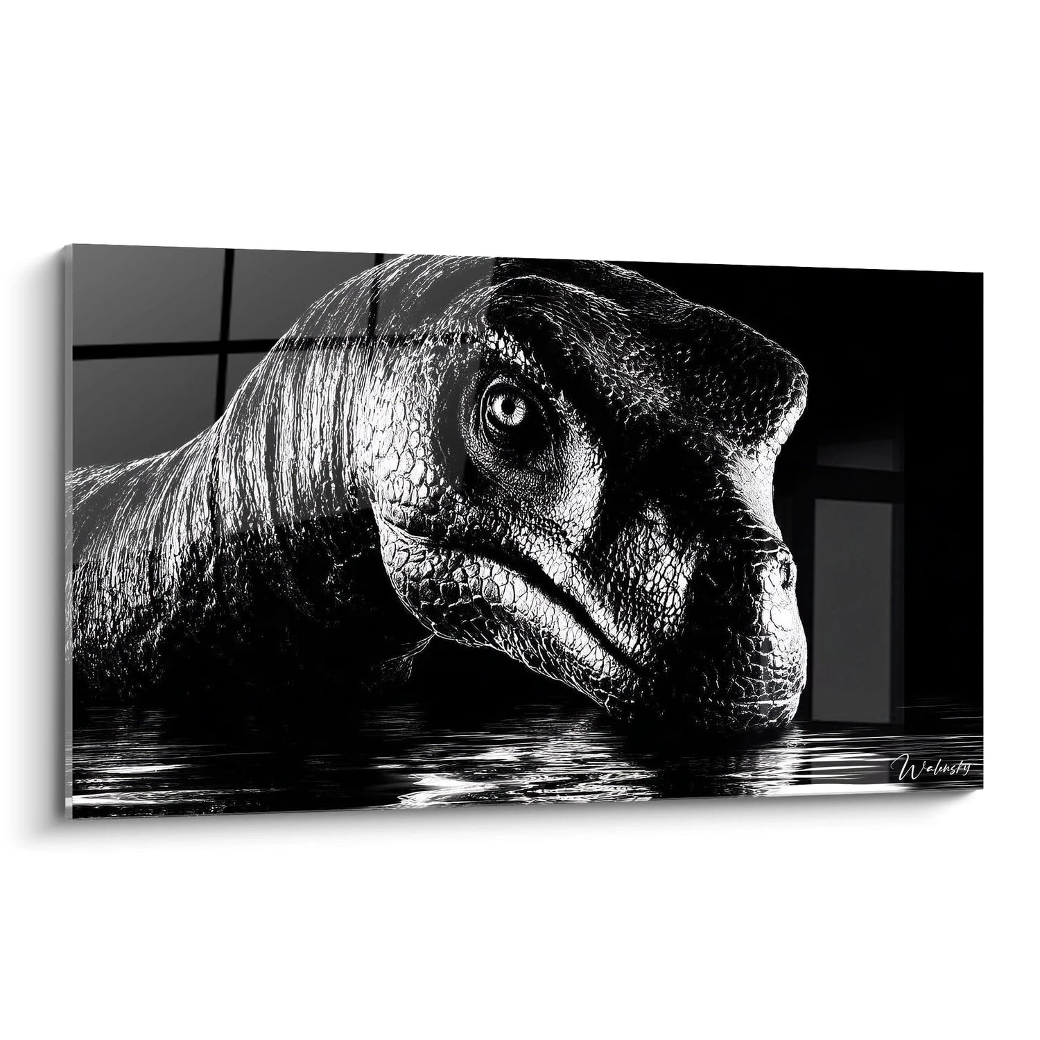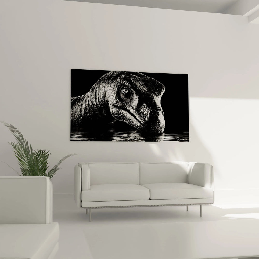 La palette monochrome noir et blanc de ce tableau dinosaure renforce l'aspect mystérieux et intemporel de l'œuvre. Cette approche chromatique épurée permet de concentrer l'attention sur les textures et les contrastes dramatiques, créant une atmosphère de suspense et de contemplation. Le noir profond des eaux symbolise l'inconnu et les mystères des temps préhistoriques, tandis que les blancs éclatants mettent en valeur la puissance primitive de cette créature légendaire.