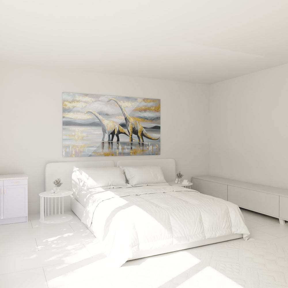 Tags : tableau diplodocus, art mural dinosaure, décoration prehistoric, sauropodes dorés, tableau crépusculaire