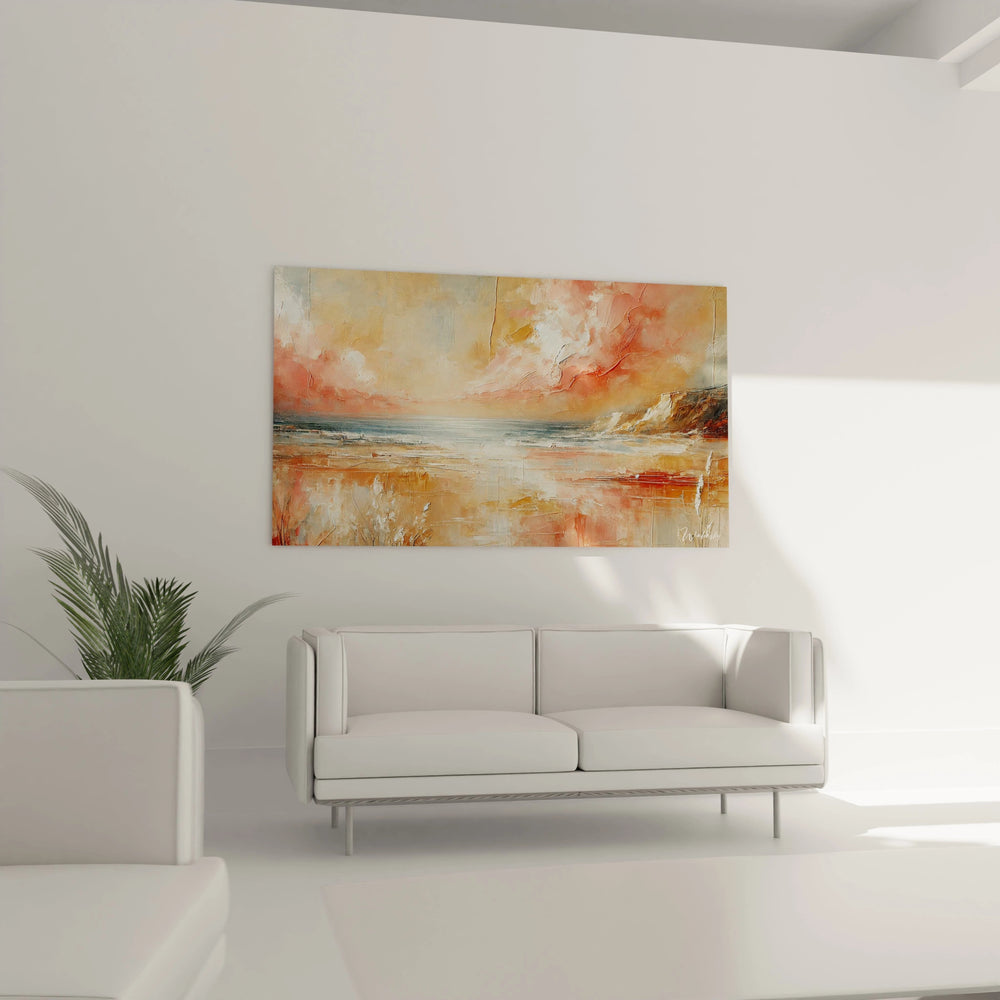 Plongez dans l’atmosphère délicate d’un crépuscule au bord de la mer grâce à ce Tableau Douceur d’Ambre - Édition Bord de Mer Abstrait. Chaque nuance chaude et chaque texture caressante capturent cette lumière dorée qui fait vibrer l’instant. Imaginez-vous face à l’horizon, où le ciel rosé embrasse doucement l’eau calme, créant un ballet lumineux empreint de poésie et de calme.