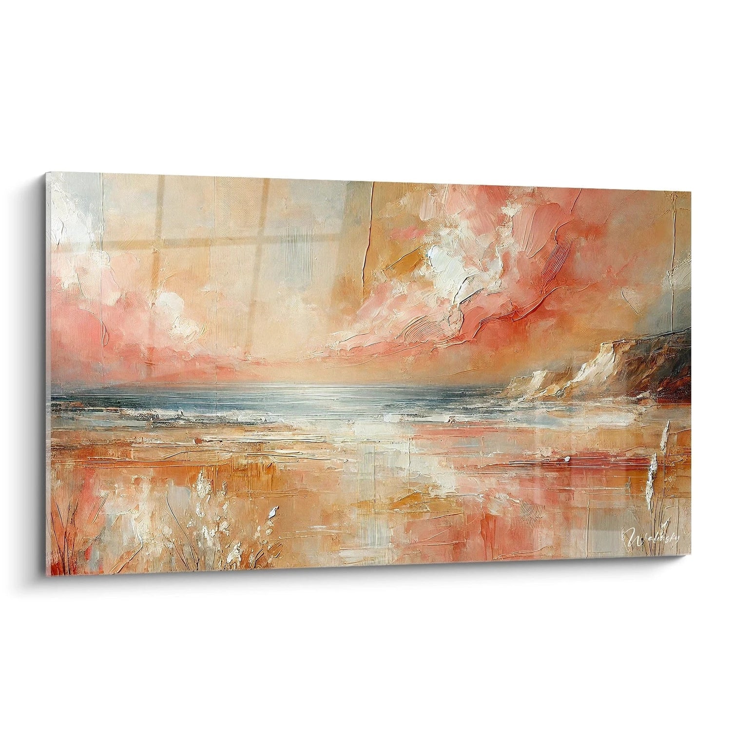 Ce tableau est bien plus qu’une simple décoration : il est un passage vers un univers de douceur et d’apaisement. Les teintes enveloppantes de rose, beige et blanc s’étalent avec une délicatesse tactile qui semble presque palpable, tandis que les formes abstraites évoquent le va-et-vient des vagues et la légèreté des nuages. Il crée une atmosphère chaleureuse où il fait bon se perdre, laissant l’esprit flotter au gré de sensations presque méditatives.