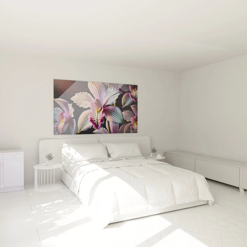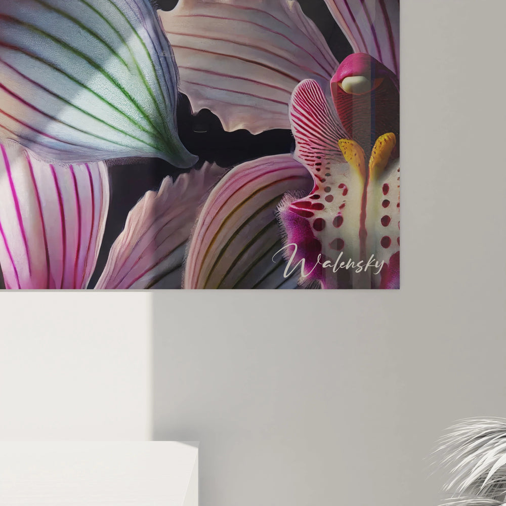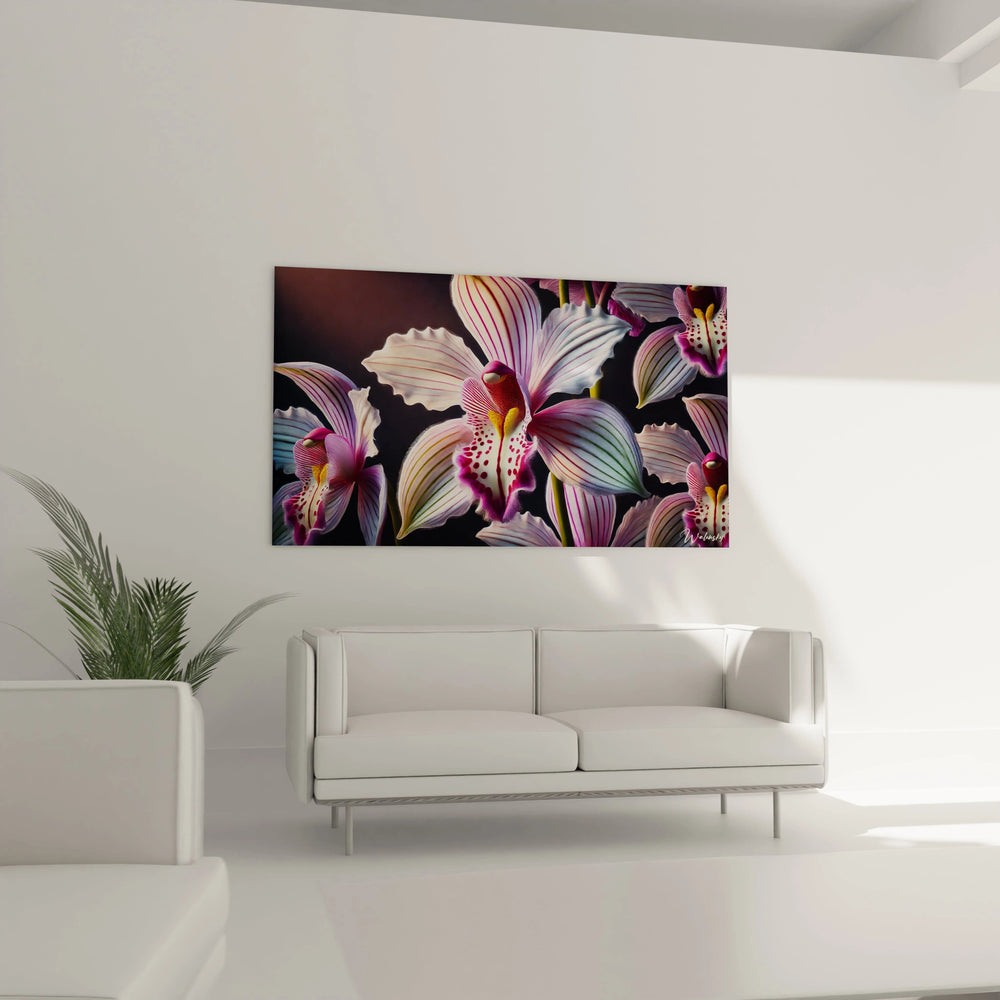 Chaque pétale d’orchidée dessiné avec une précision exquise évoque la fragilité et la force qui cohabitent dans la nature. Ce tableau vous transporte dans un univers où les nuances subtiles de rose, blanc et violet se mêlent à un fond sombre mystérieux, mettant en lumière la pureté des fleurs. Ces contrastes créent une tension harmonieuse qui invite à ralentir le rythme et à s’abandonner à une sensation apaisante et profondément émouvante.