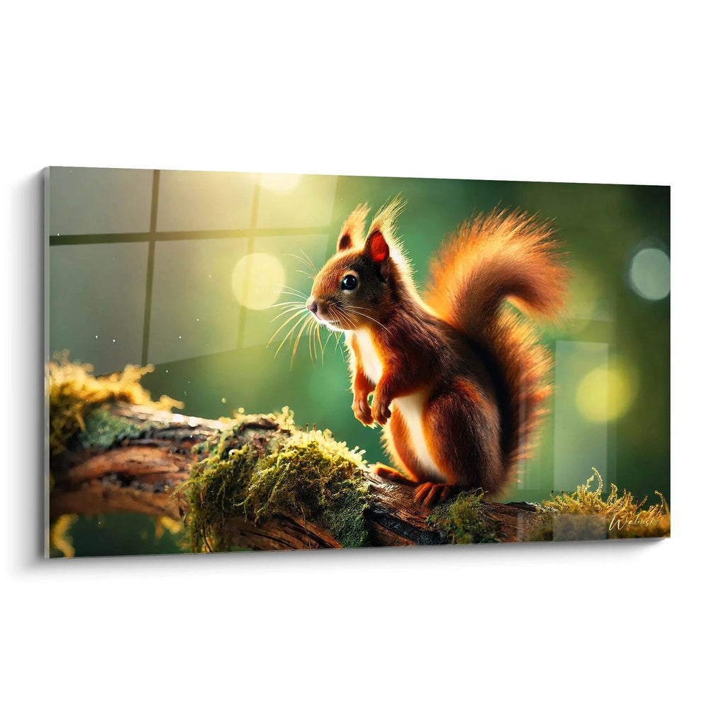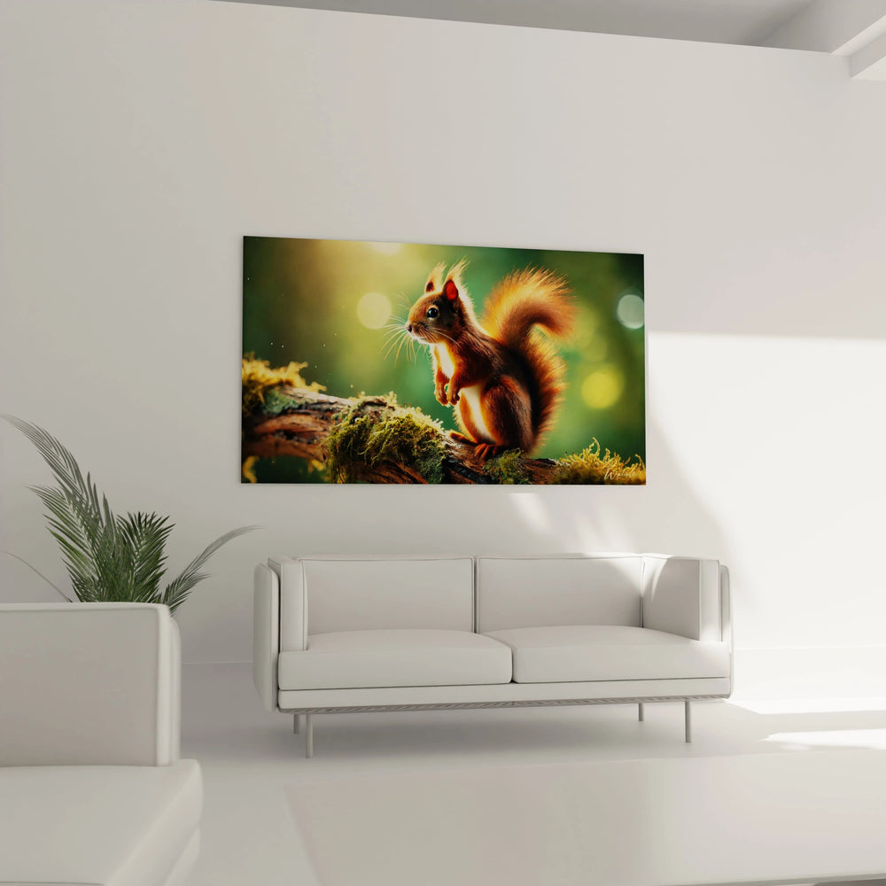 Au centre de cette œuvre, un écureuil s’éveille doucement, son pelage d’un orange flamboyant illuminé par la lumière chaude qui filtre à travers les feuillages. Sa posture, délicate et curieuse, incarne cette énergie vivace et légère qui enrichit chaque matin de promesses et d’émerveillements. Vous sentez presque la fragilité veloutée de sa queue, le souffle apaisant de la forêt qui l’entoure, et cette atmosphère de calme enveloppante.