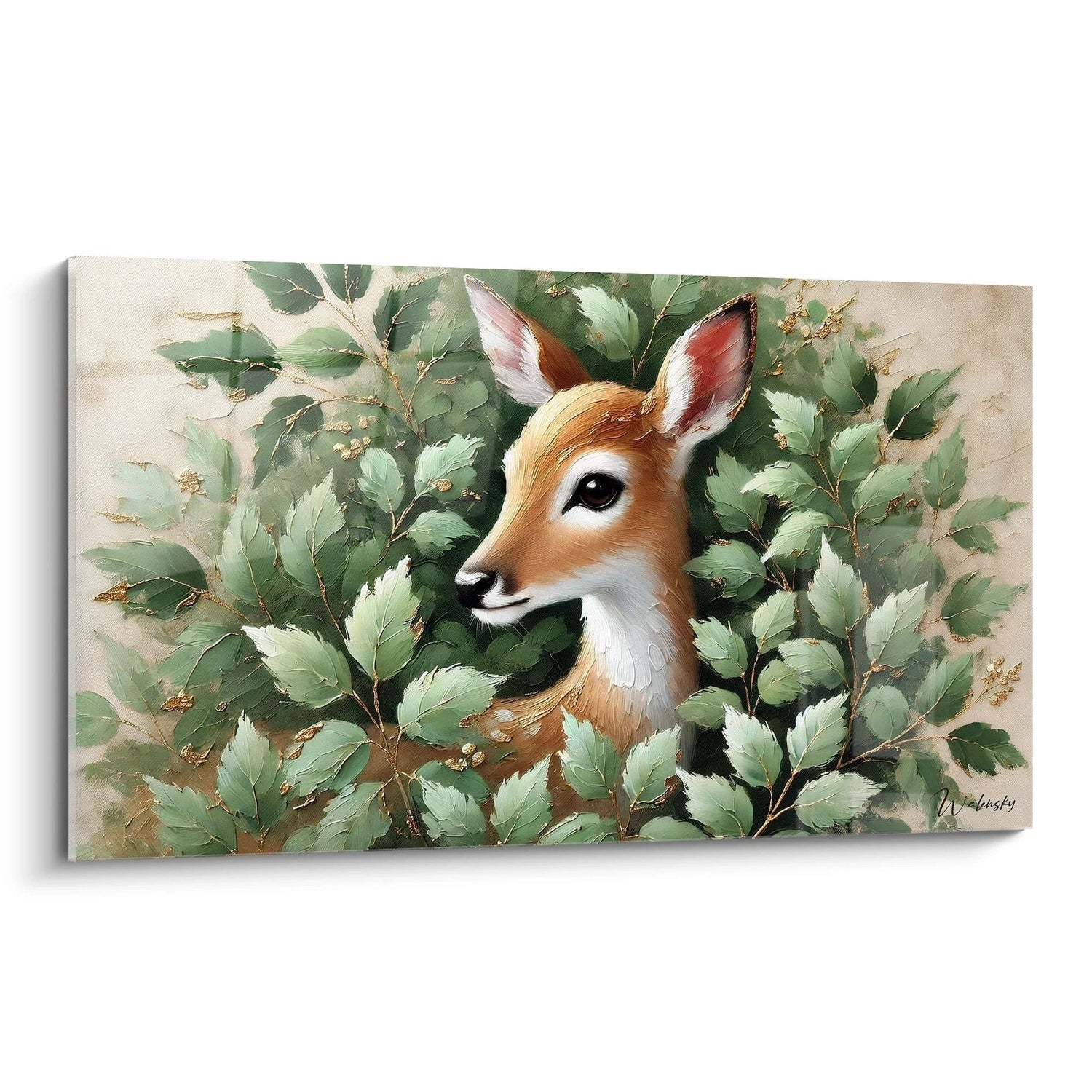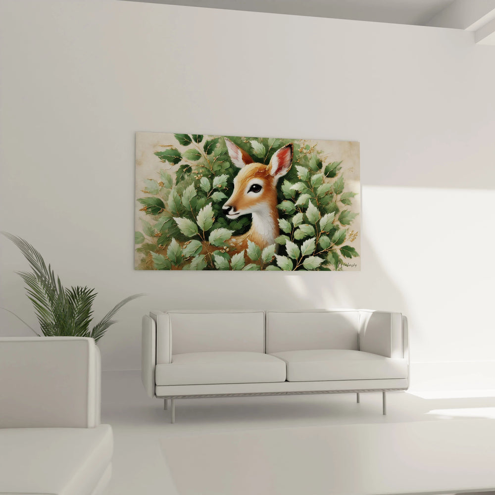 Les nuances apportées – un mélange harmonieux de verts profonds, de beiges doux et d’or chaleureux – apportent à votre intérieur une atmosphère à la fois fraîche et enveloppante. Chaque feuille semble caresser la biche, dont la présence délicate impose calme et douceur. Ressentez la poésie de ce tableau, où la minutie des détails rencontre la fluidité du style semi-réaliste, donnant vie à un cadre naturel empreint de légèreté.