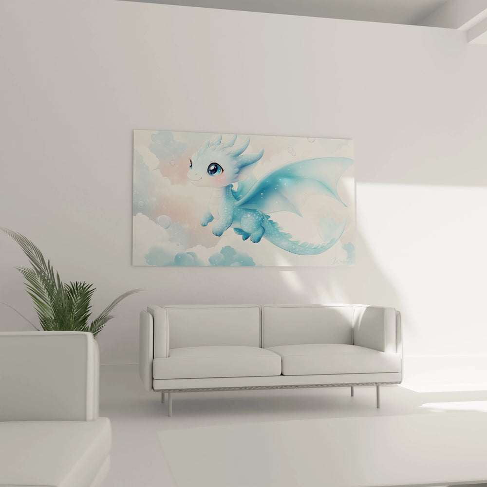 Chaque regard posé sur ce tableau ouvre une porte vers des histoires enchantées. La présence bienveillante du dragon, douce et puissante à la fois, compose une atmosphère apaisante. Son expression empreinte d’innocence suscite un sentiment de sécurité et stimule l’imagination, transportant petits et grands vers des contrées où la magie devient palpable. Une véritable bulle d’évasion suspendue au mur, conçue pour inspirer et rassurer.