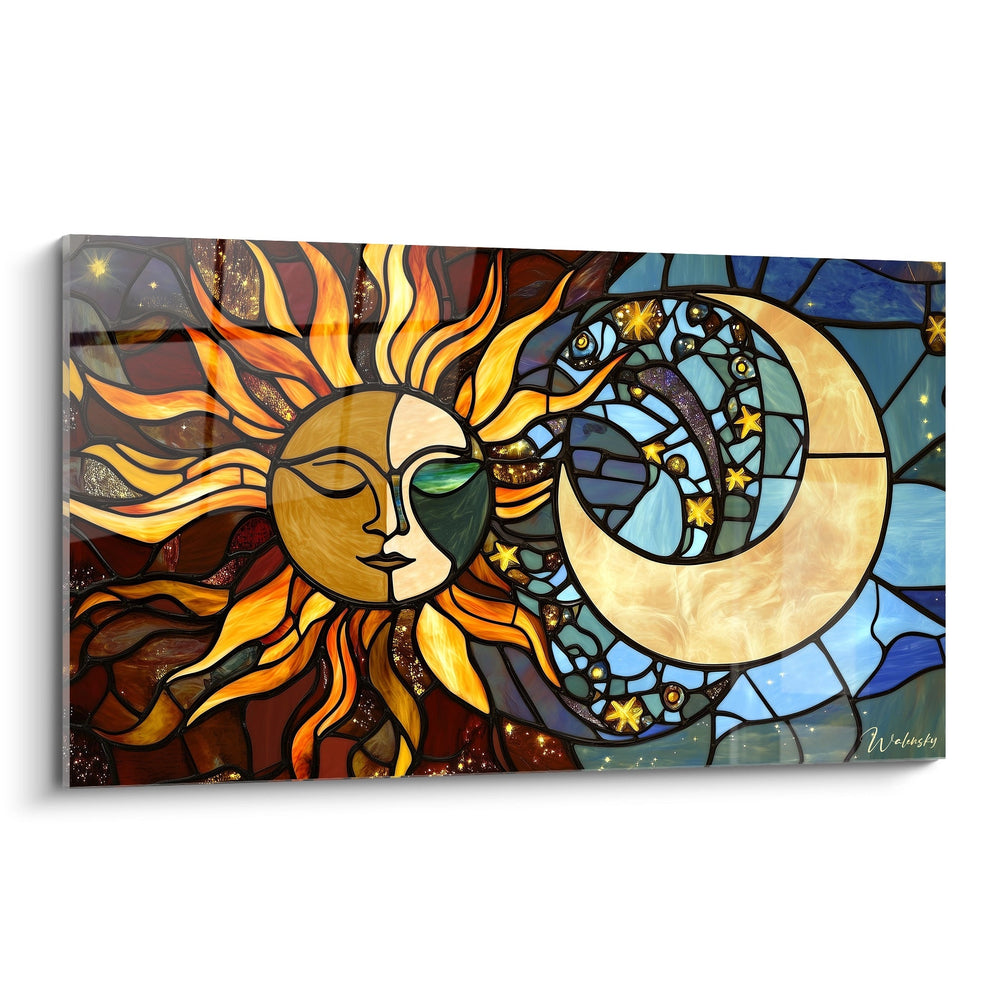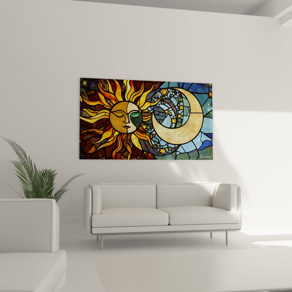 La composition de ce tableau vitraux cosmique artisanal repose sur un équilibre magistral entre symétrie et asymétrie. Au centre de l'œuvre, le visage du soleil, mi-doré mi-vert, occupe l'espace avec autorité, tandis que ses rayons flamboyants s'étendent vers la gauche en mouvements ondulants. Le croissant lunaire encadre la partie droite, créant une courbe harmonieuse qui enveloppe un ciel nocturne parsemé d'étoiles.