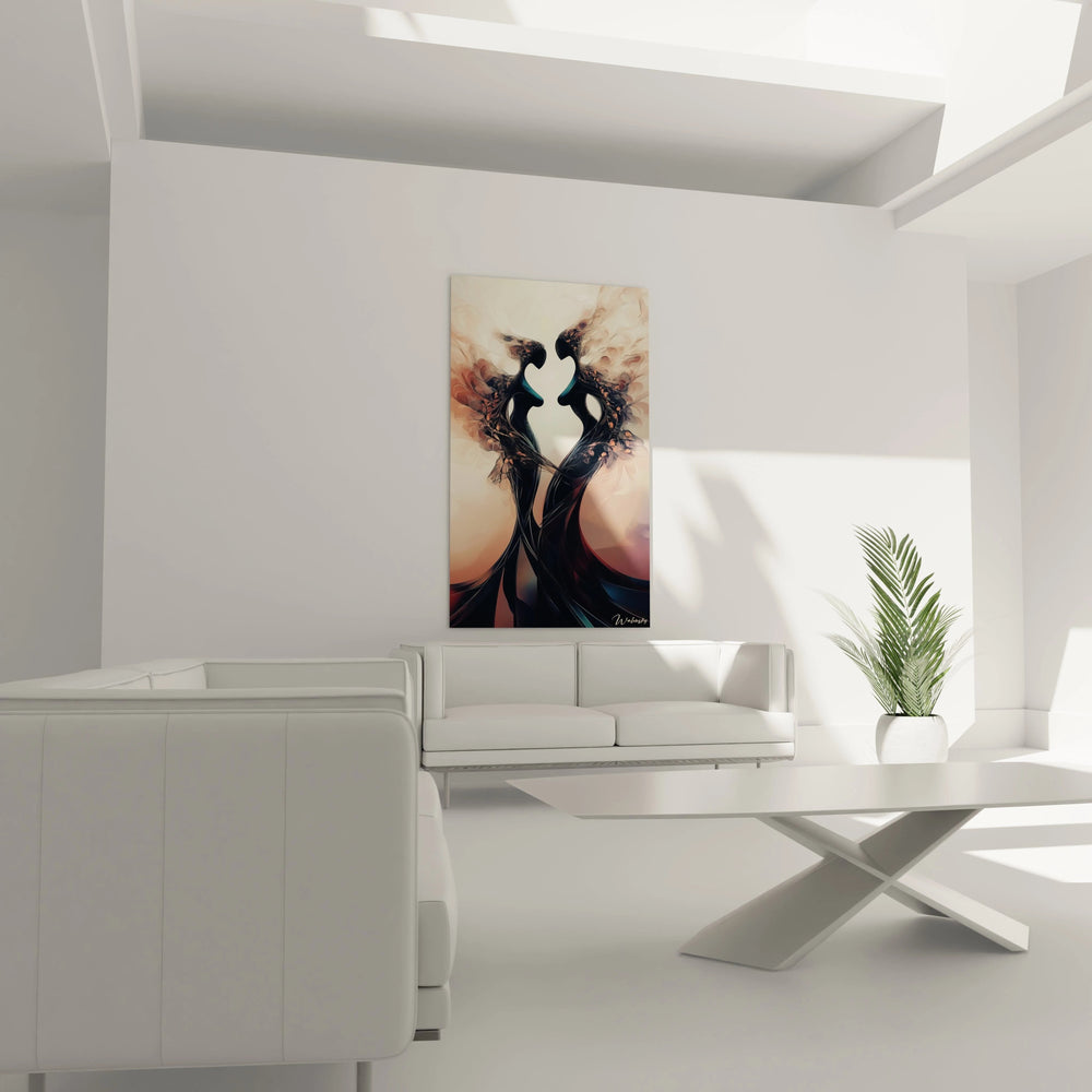 Ce tableau évoque une chorégraphie silencieuse où chaque ligne, chaque courbe, devient un murmure entre force et délicatesse. Les teintes raffinées de beige, de noir profond et de bronze étincelant se marient avec une fluidité aérienne, comme une brise légère caressant la surface, donnant vie à une atmosphère enveloppante et sereine. Laissez-vous emporter par cette alliance harmonieuse qui reflète la dualité infinie de l’existence, de l’invisible tissage des liens qui unissent les âmes aux mystères du cosmos.
