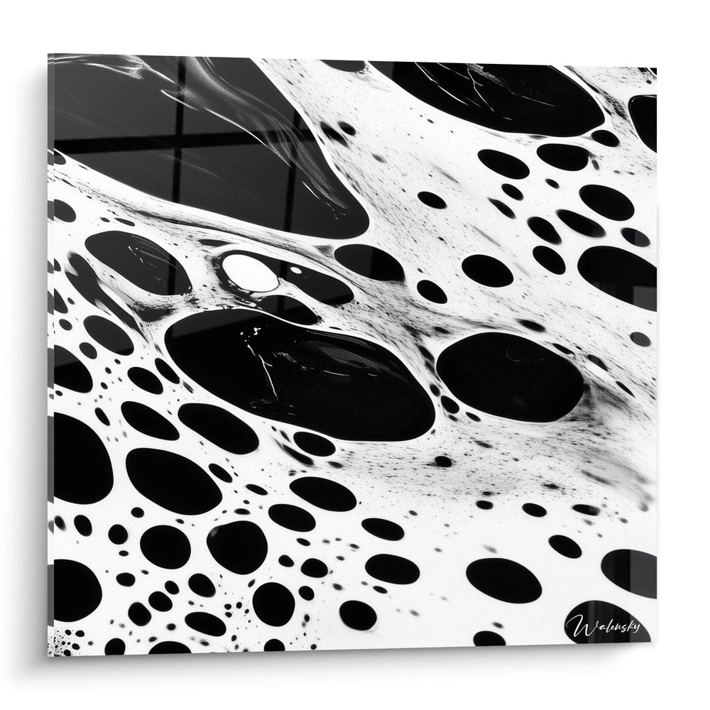 Ce tableau tacheté noir et blanc captive immédiatement le regard par son contraste saisissant et ses formes organiques distinctives. La composition présente une fascinante structure cellulaire où des taches noires de différentes tailles semblent flotter sur un fond blanc immaculé. L'œuvre évoque un univers microscopique figé dans le temps, où chaque tache noire crée un motif dynamique qui guide l'œil à travers la surface. Ce qui distingue ce tableau tacheté, c'est l'équilibre parfait entre les éléments noirs et l'espace blanc, créant une tension visuelle qui maintient l'intérêt du spectateur à travers cette danse monochrome de formes abstraites.