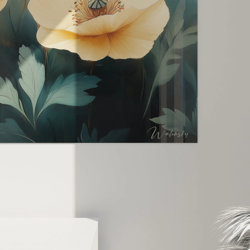 L'atmosphère lumineuse exceptionnelle constitue un autre élément distinctif majeur. La lumière semble émaner des fleurs elles-mêmes, créant un effet de rayonnement intérieur qui transforme cette décoration murale florale en véritable fenêtre sur un monde enchanté. Cette qualité lumineuse unique confère à l'œuvre une présence presque vivante, comme si les coquelicots respiraient doucement dans leur environnement doré.