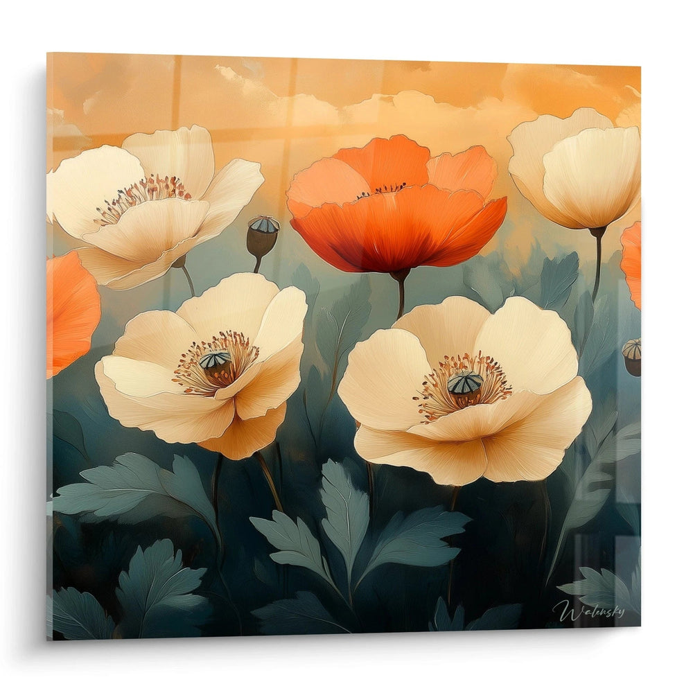 Ce tableau coquelicots captivant présente une composition florale harmonieuse où des fleurs orange vif et blanc crème s'épanouissent avec grâce. L'arrière-plan aux dégradés orange-bleu crée une atmosphère onirique qui met parfaitement en valeur le sujet principal. Les coquelicots, représentés avec un soin méticuleux, révèlent chaque détail de leurs pétales délicats et de leurs cœurs sombres caractéristiques, offrant une expérience visuelle immersive dans ce jardin artistique idéalisé.