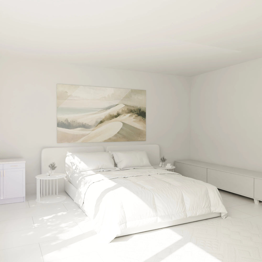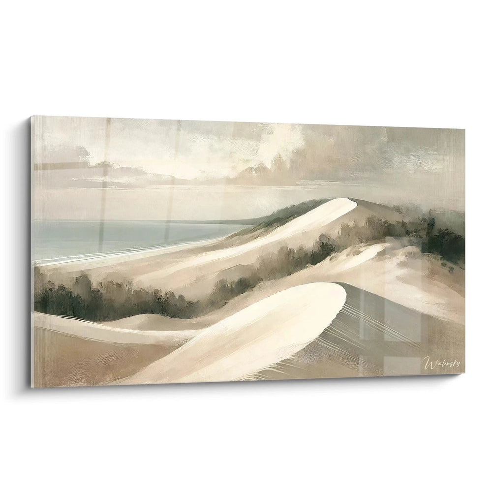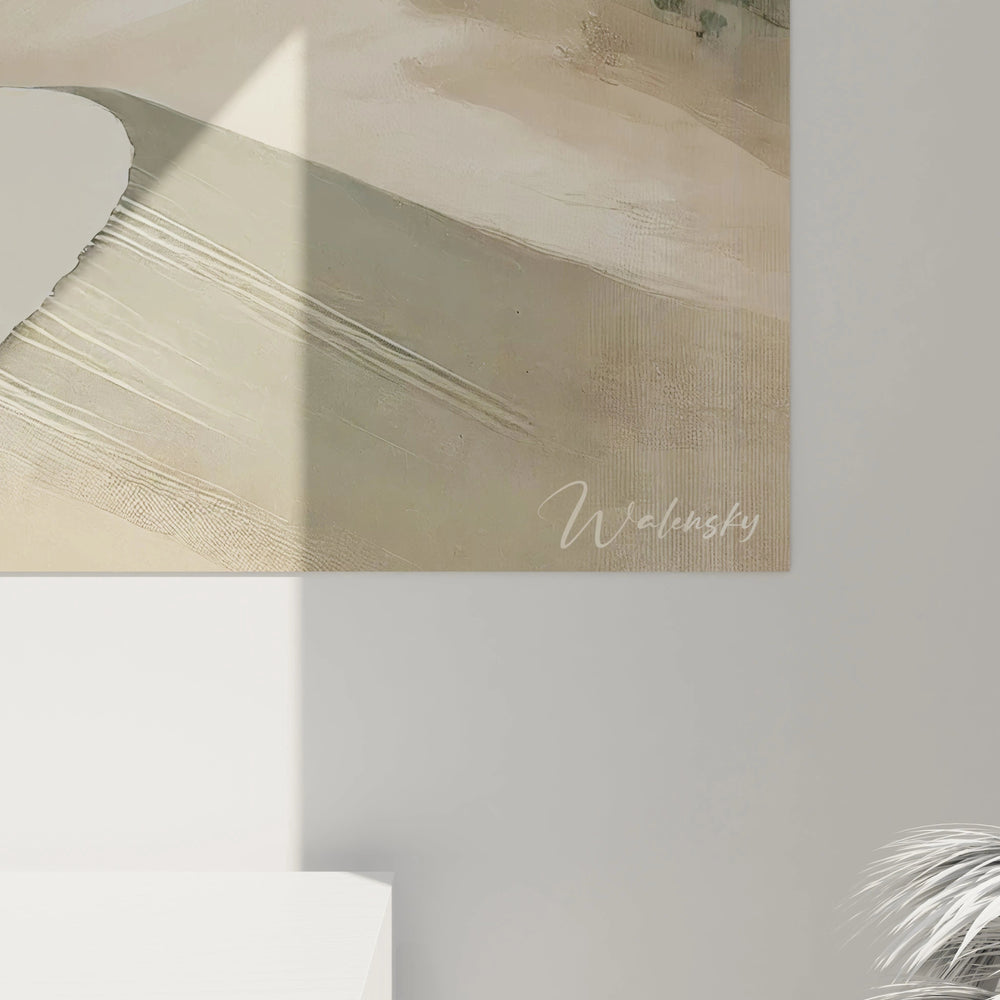 Le style réaliste minimaliste choisi pour cette œuvre sublime la beauté brute des dunes. Il ne distrait pas mais invite à un instant de pause, où chaque regard se perd dans la simplicité harmonieuse du paysage. Ce tableau représente bien plus que le décor : il incarne le temps qui s’efface doucement, les souvenirs emportés par la brise et la promesse d’une quiétude retrouvée.