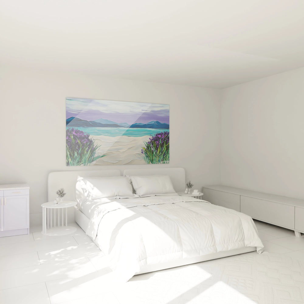 Vu de près, ce tableau lavande révèle une multitude de détails dans les empâtements floraux, chaque touche de peinture créant une fleur distincte. À distance, l'ensemble se fond en masses colorées cohérentes qui renforcent l'effet de perspective. Les montagnes à l'horizon présentent des dégradés subtils de bleus qui suggèrent la distance et la brume atmosphérique. L'art mural lavande méditerranéen prend toute sa dimension lorsqu'on observe les variations de lumière sur les reliefs peints, créant des jeux d'ombres qui animent la surface selon l'éclairage ambiant.